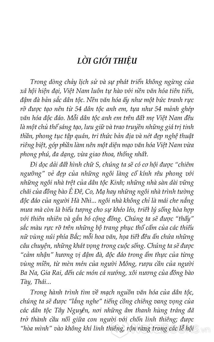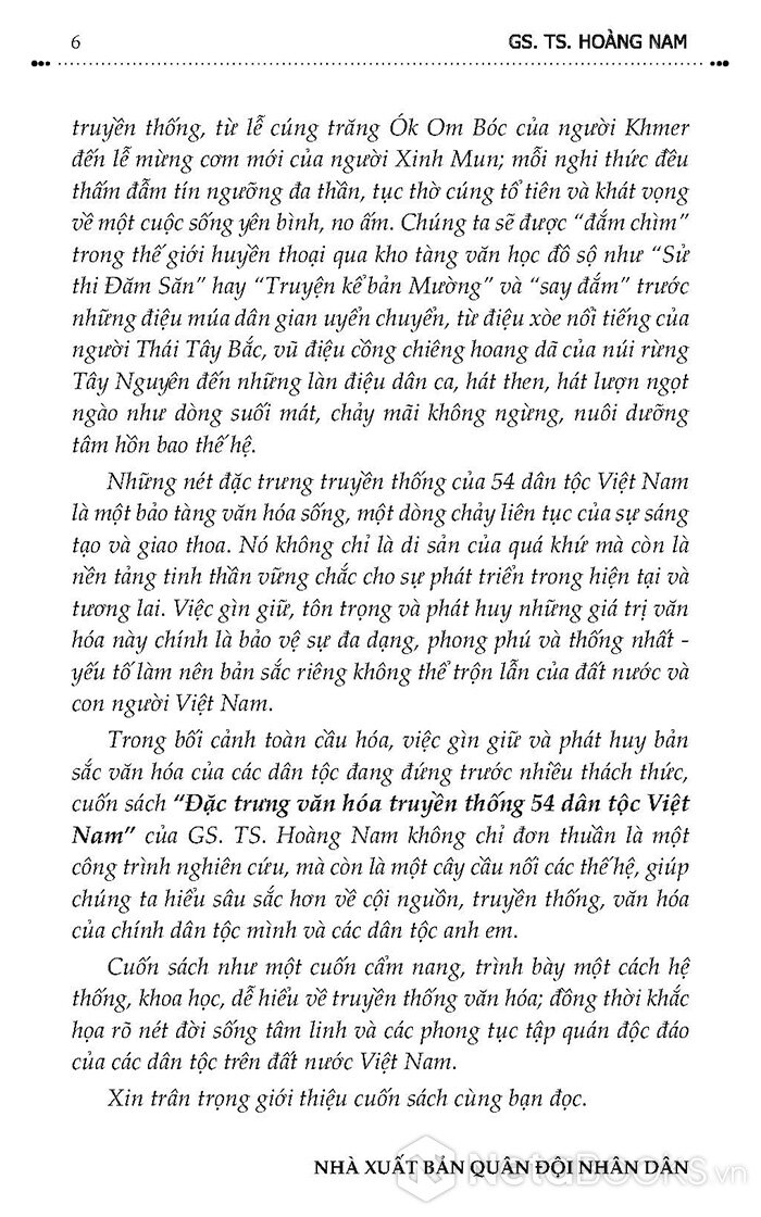 Bộ sách "Đặc trưng văn hóa truyền thống 54 dân tộc Việt Nam" là một hành trình rực rỡ sắc màu đi dọc dải đất hình chữ S để khám phá "bảo tàng sống" của đại gia đình các dân tộc anh em. Qua ngòi bút hệ thống và khoa học của GS. TS. Hoàng Nam, tác phẩm không chỉ đơn thuần cung cấp tư liệu về tên gọi, địa bàn cư trú hay đặc điểm kinh tế, mà còn mở ra một không gian văn hóa đa chiều: từ kiến trúc nhà sàn, nhà trình tường độc đáo đến những họa tiết thổ cẩm tinh xảo; từ tiếng cồng chiêng vang vọng đại ngàn đến những làn điệu then, lượn ngọt ngào say đắm.