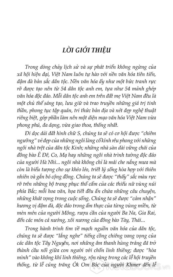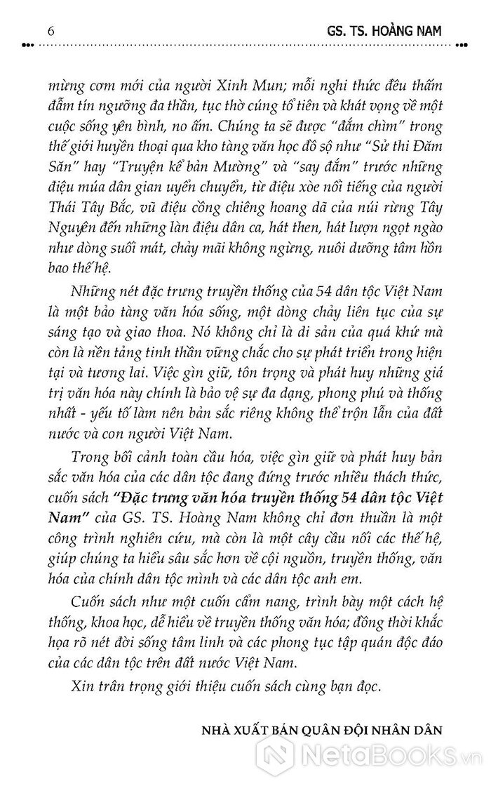 Bộ sách "Đặc trưng văn hóa truyền thống 54 dân tộc Việt Nam" là một hành trình rực rỡ sắc màu đi dọc dải đất hình chữ S để khám phá "bảo tàng sống" của đại gia đình các dân tộc anh em. Qua ngòi bút hệ thống và khoa học của GS. TS. Hoàng Nam, tác phẩm không chỉ đơn thuần cung cấp tư liệu về tên gọi, địa bàn cư trú hay đặc điểm kinh tế, mà còn mở ra một không gian văn hóa đa chiều: từ kiến trúc nhà sàn, nhà trình tường độc đáo đến những họa tiết thổ cẩm tinh xảo; từ tiếng cồng chiêng vang vọng đại ngàn đến những làn điệu then, lượn ngọt ngào say đắm.