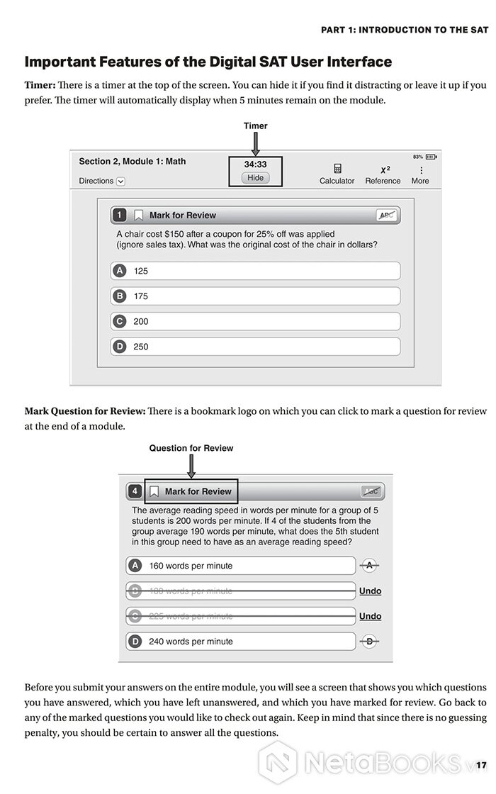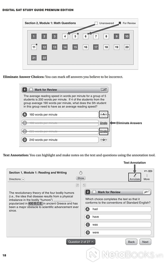 Không dừng lại ở việc cung cấp bài tập, Digital SAT Study Guide Premium Edition còn hướng dẫn chi tiết cách tiếp cận từng phần thi, từ Reading & Writing cho đến Math. Bạn sẽ được chỉ dẫn cách phân bổ thời gian, cách đọc nhanh mà vẫn nắm ý chính, cũng như mẹo xử lý các dạng toán thường xuyên xuất hiện. Mỗi trang sách giống như một lớp học thu nhỏ, nơi bạn được “huấn luyện” để vừa vững kiến thức, vừa có chiến lược thi cử rõ ràng.