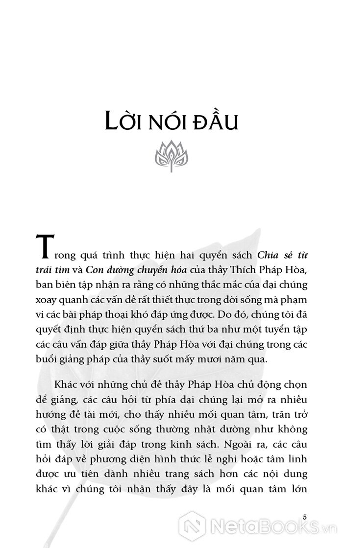 Trong quá trình thực hiện hai quyển sách Chia sẻ từ trái tim và Con đường chuyển hóa, ban biên tập nhận ra rằng có những thắc mắc của đại chúng xoay quanh các vấn đề rất thiết thực trong đời sống mà phạm vi các bài pháp thoại khó đáp ứng được. Đây là những câu hỏi nảy sinh trong quá trình tu tập hoặc tìm hiểu và áp dụng giáo lý đạo Phật vào đời sống của đại chúng, gửi đến thầy Thích Pháp Hòa trực tiếp tại buổi giảng hoặc qua email và được thầy giải đáp một cách thỏa đáng. Các câu vấn đáp được chọn lọc là những thắc mắc của cá nhân người hỏi nhưng mang tính phổ quát và rất đáng chia sẻ.