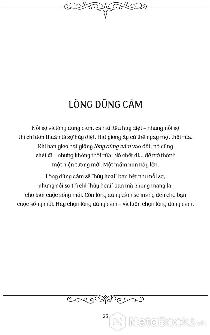 Lòng dũng cảm sẽ “hủy hoại” bạn hệt như nỗi sợ, nhưng nỗi sợ thì chỉ “hủy hoại” bạn mà không mang lại cho bạn cuộc sống mới. Còn lòng dũng cảm sẽ mang đến cho bạn cuộc sống mới. Hãy chọn lòng dũng cảm - và luôn chọn lòng dũng cảm. (Trang 25)