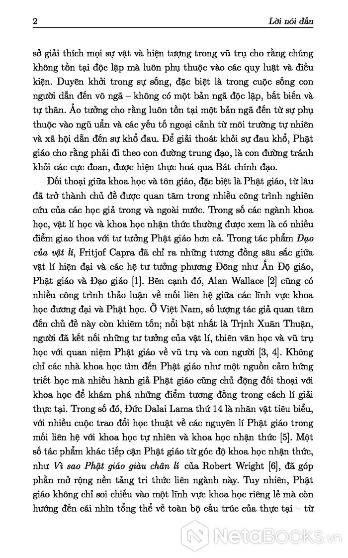 Kinh sách của Phật giáo thì vô cùng đồ sộ với nhiều trường phái khác nhau. Cuốn sách này chỉ đề cập đến ba nguyên lí của Phật giáo mà theo tôi là cơ bản nhất: duyên khởi, sự khổ và trung đạo. Ba nguyên lí đó quán chiếu vào khoa học hiện đại về thế giới vật chất, sự sống, cơ thể và ý thức. Duyên khởi là nguồn gốc, là cơ sở giải thích mọi sự vật và hiện tượng trong vũ trụ cho rằng chúng không tồn tại độc lập mà luôn phụ thuộc vào các điều kiện và yếu tố khác. Duyên khởi trong sự sống, đặc biệt là trong cuộc sống con người dẫn đến vô ngã – không có một bản ngã bất biến và tự thân. Ảo tưởng cho rằng luôn tồn tại một bản ngã đến từ sự phụ thuộc vào ngũ uẩn và các yếu tố ngoại cảnh từ môi trường tự nhiên và xã hội dẫn đến sự khổ đau. Để giải thoát khỏi sự đau khổ, Phật giáo cho rằng phải đi theo con đường trung đạo, là con đường tránh mọi thái cực.
