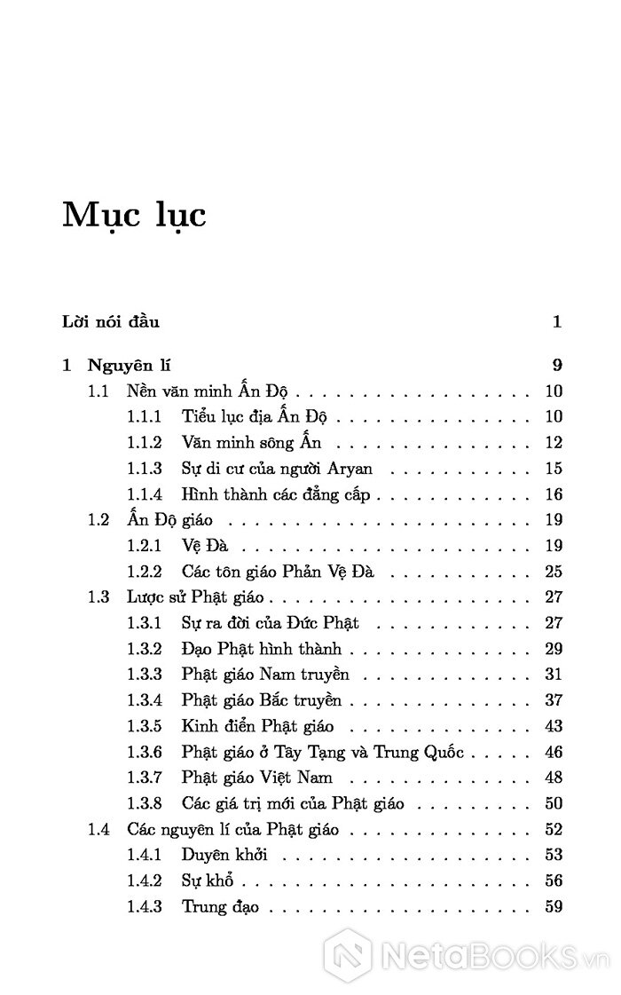 - Chương 1: Trình bày sơ lược về nền văn minh Ấn Độ trước khi Phật giáo ra đời, sự cải cách của Phật giáo trên nền tảng của Ấn Độ giáo, sự phát triển của Phật giáo ở Ấn Độ và ở Việt Nam và các nguyên lí của Phật giáo.