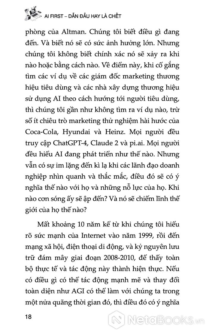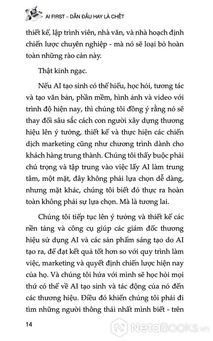 Sách không chỉ cảnh báo về tốc độ thay đổi của công nghệ, mà còn đưa ra một con đường rõ ràng để doanh nghiệp xây dựng lợi thế cạnh tranh bền vững bằng cách trở thành AI first. Với ngôn ngữ dễ tiếp cận, nhiều ví dụ thực tế và khung triển khai cụ thể, đây là sách không thể thiếu cho lãnh đạo doanh nghiệp, nhà marketing, quản lý sản phẩm và bất cứ ai đang tham gia vào hành trình chuyển đổi AI.
