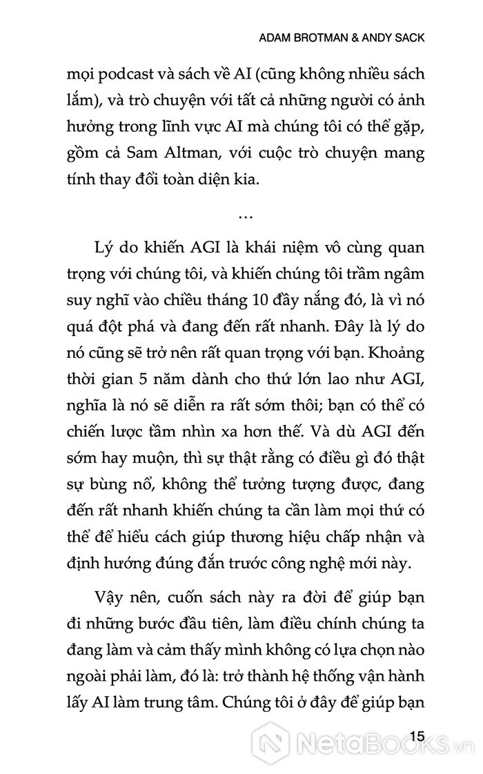 Dựa trên kinh nghiệm của các tác giả trong việc xây dựng sản phẩm, thương hiệu và hệ thống dữ liệu, cùng các cuộc trò chuyện với những lãnh đạo công nghệ hàng đầu (như Sam Altman, Bill Gates và Reid Hoffman), cuốn sách đưa ra cấu trúc rõ ràng gồm 5 trụ cột chính để doanh nghiệp tái cấu trúc theo hướng “AI First” - nghĩa là thiết kế mọi hoạt động dựa trên năng lực AI ngay từ gốc.