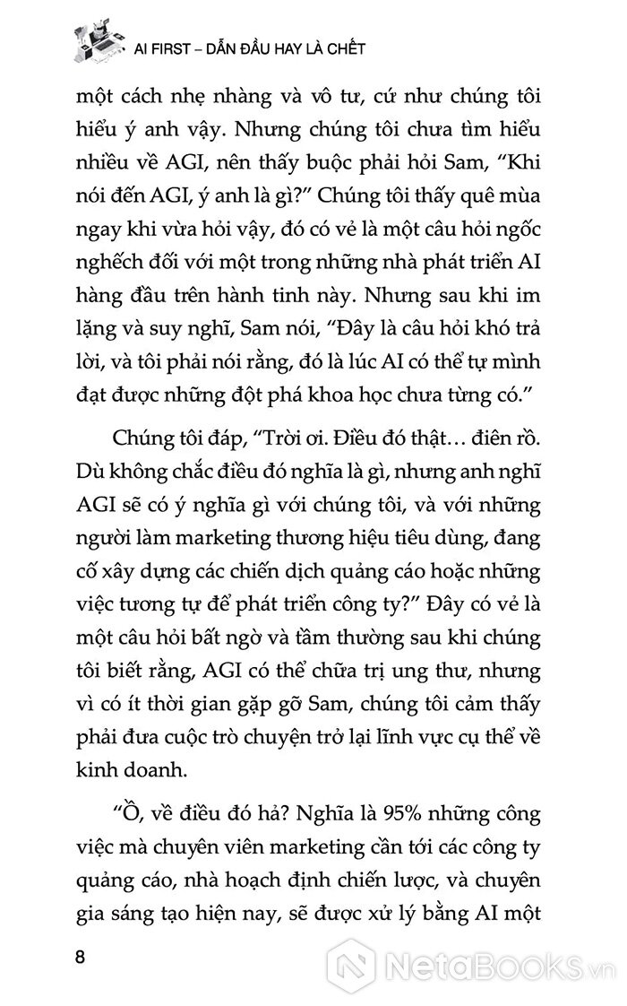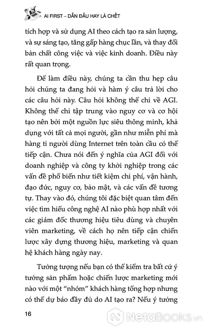 “AI First - Dẫn đầu hay là chết” được xuất bản bởi Harvard Business Review Press, không tập trung vào kỹ thuật lập trình hay chi tiết thuật toán; thay vào đó, nó đưa ra khung tư duy chiến lược, quy trình chuyển đổi, mô hình tổ chức và các hướng dẫn thực tế mà mọi lãnh đạo đều có thể áp dụng. Tác giả nhấn mạnh rằng AI không chỉ là công cụ hỗ trợ, mà là “cơ chế vận hành mới” cho marketing, thương hiệu, trải nghiệm khách hàng và thậm chí cấu trúc tổ chức. Một doanh nghiệp AI-first không đơn thuần tích hợp AI vào quy trình cũ, mà tái thiết kế chiến lược, sản phẩm và trải nghiệm dựa trên khả năng của AI.
