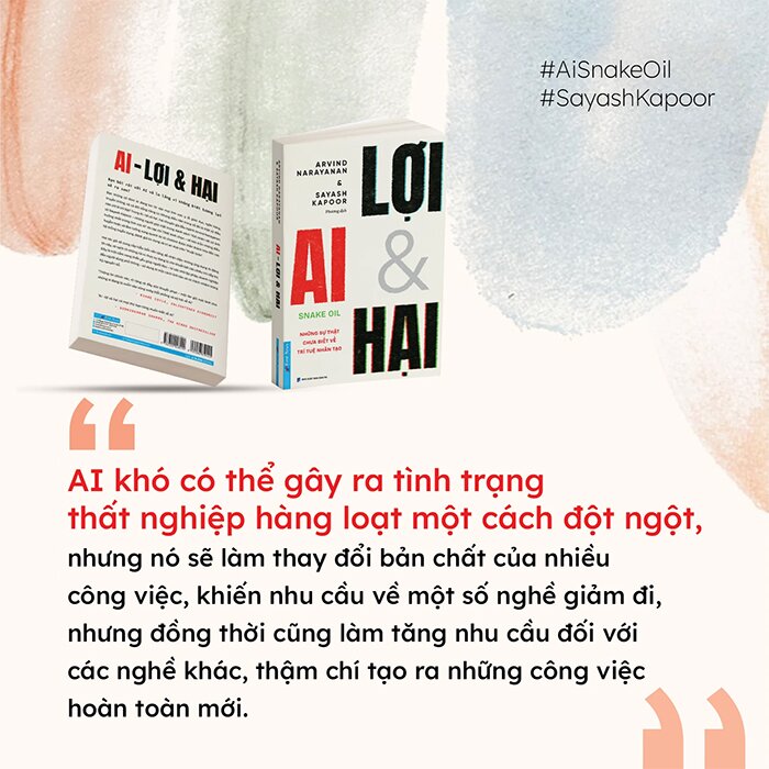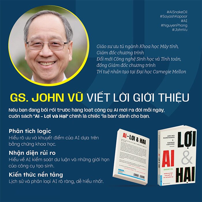 “AI - Lợi và Hại” là quyển sách không thể bỏ qua nếu bạn đang hoang mang trước làn sóng AI. Hai chuyên gia hàng đầu - Sayash Kapoor và Arvind Narayanan, những người nằm trong danh sách TIME 100 AI - sẽ chỉ ra đâu là tiềm năng có thật, đâu là chiêu trò quảng cáo thổi phồng. Quyển sách vạch trần những tuyên bố sai lệch về AI trong các lĩnh vực giáo dục, y tế, tài chính, pháp luật, và mạng xã hội; đồng thời cung cấp công cụ để bạn tự bảo vệ mình trước các sản phẩm “AI bịp bợm” - vô dụng nhưng được quảng bá rầm rộ. Tỉnh táo, sắc sảo và dễ hiểu, đây là kim chỉ nam để bạn hiểu rõ và ra quyết định đúng đắn với AI.