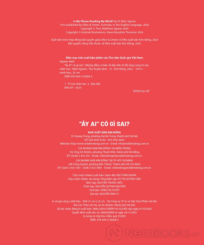 Sách "Ây Ai" Có Gì Sai? - Những Điều Cơ Bản Về Đạo Đức AI Để Sống Cùng Trí Tuệ Nhân Tạo của tác giả TS. Matt Agnew, có bán tại Nhà sách online NetaBooks với ưu đãi Bao sách miễn phí và Gian hàng NetaBooks tại Tiki với ưu đãi Bao sách miễn phí và tặng Bookmark