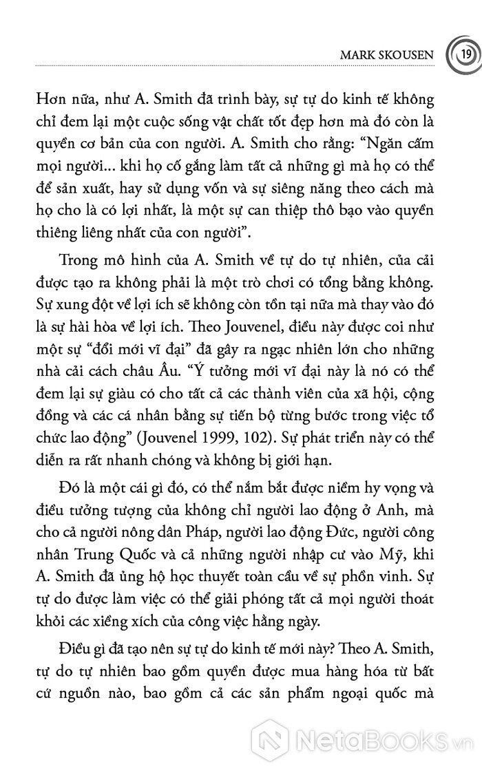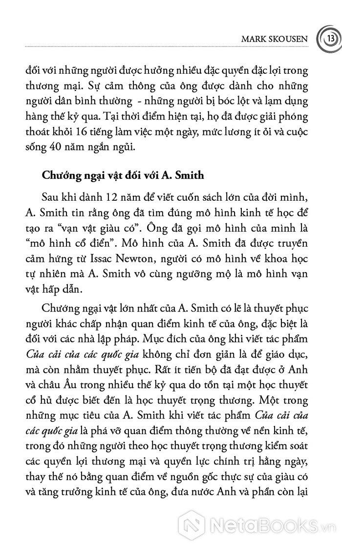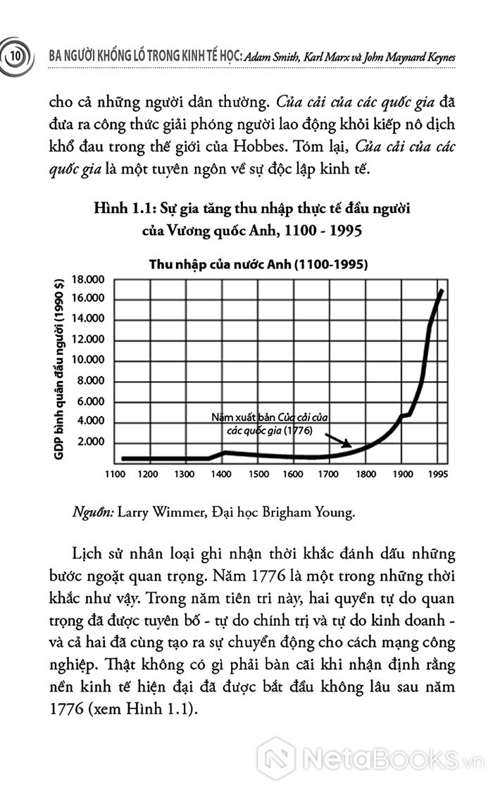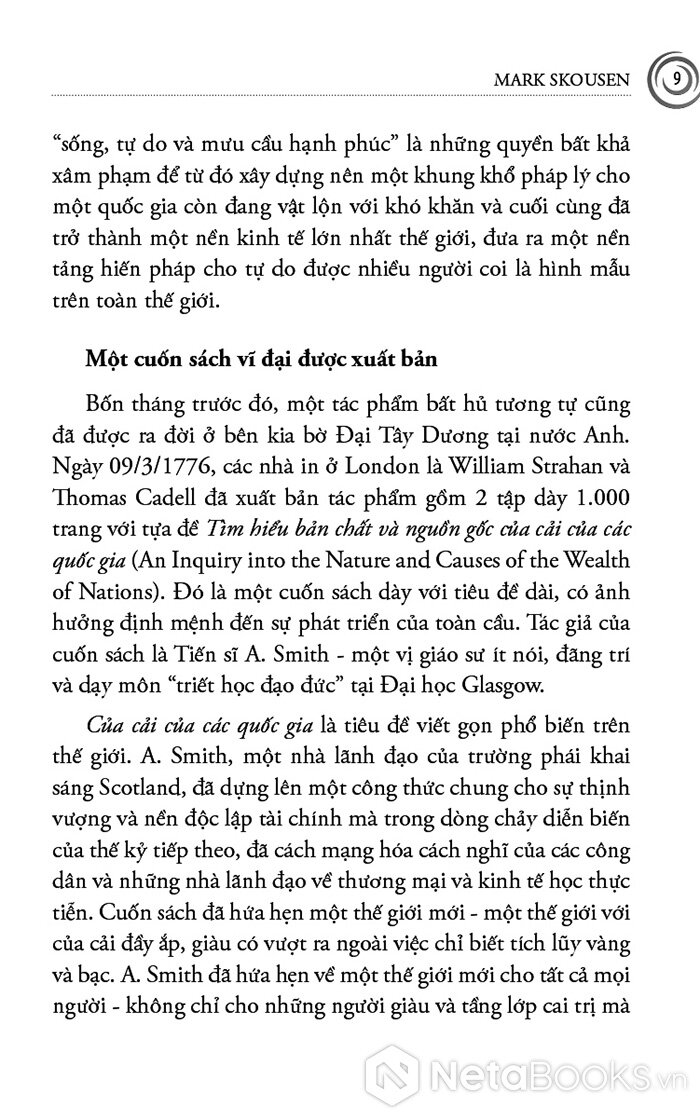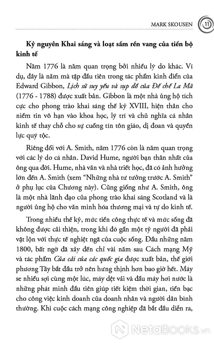 Cuốn sách mở đầu bằng Adam Smith - người đặt nền móng cho kinh tế học hiện đại với niềm tin vào thị trường tự do, cạnh tranh và “bàn tay vô hình”. Skousen không chỉ trình bày những nguyên lý cơ bản của Smith, mà còn tái hiện bối cảnh Cách mạng Công nghiệp, khi tư bản, lao động và thương mại bùng nổ, buộc nhân loại phải lần đầu tiên suy nghĩ một cách có hệ thống về sản xuất, phân phối và tăng trưởng. Từ đó, người đọc hiểu vì sao tư tưởng tự do kinh tế lại có sức sống mãnh liệt đến vậy trong suốt thế kỷ XIX và đầu thế kỷ XX.