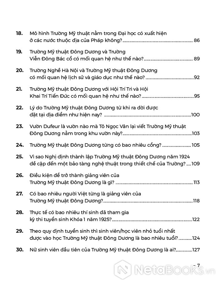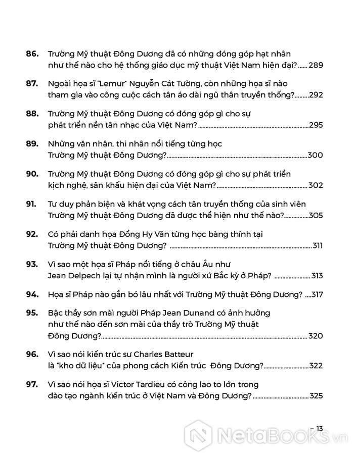 Qua cuốn sách “Bách niên bách vấn: 100 câu hỏi về lịch sử Trường Mỹ Thuật Đông Dương” hai tác giả Phạm Long và Trần Hậu Yên Thế không chỉ cung cấp tư liệu, kiến thức về bối cảnh lịch sử, hệ thống tổ chức, đội ngũ giáo sư và thành tựu của sinh viên, mà còn giải đáp những thắc mắc thú vị như: vì sao trường có nhiều tên gọi khác nhau; lý do lựa chọn địa điểm; danh sách các hiệu trưởng/quyền hiệu trưởng; và liệu có phải trường chỉ đào tạo họa sĩ…