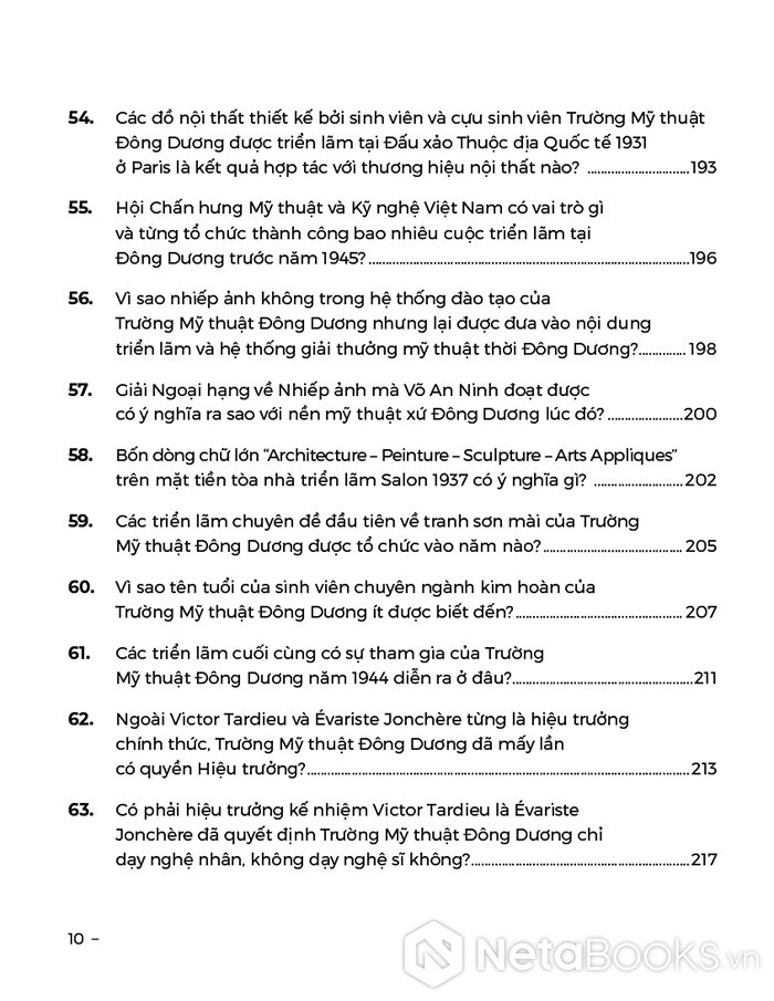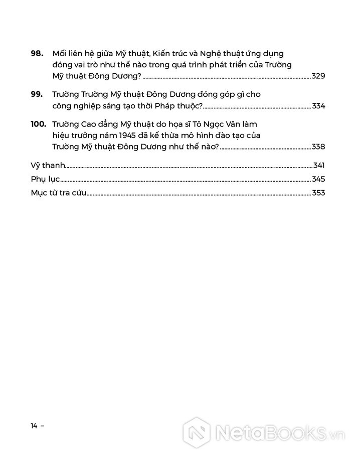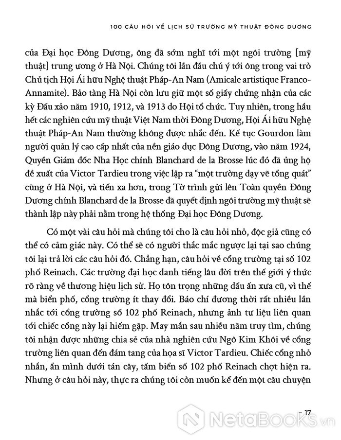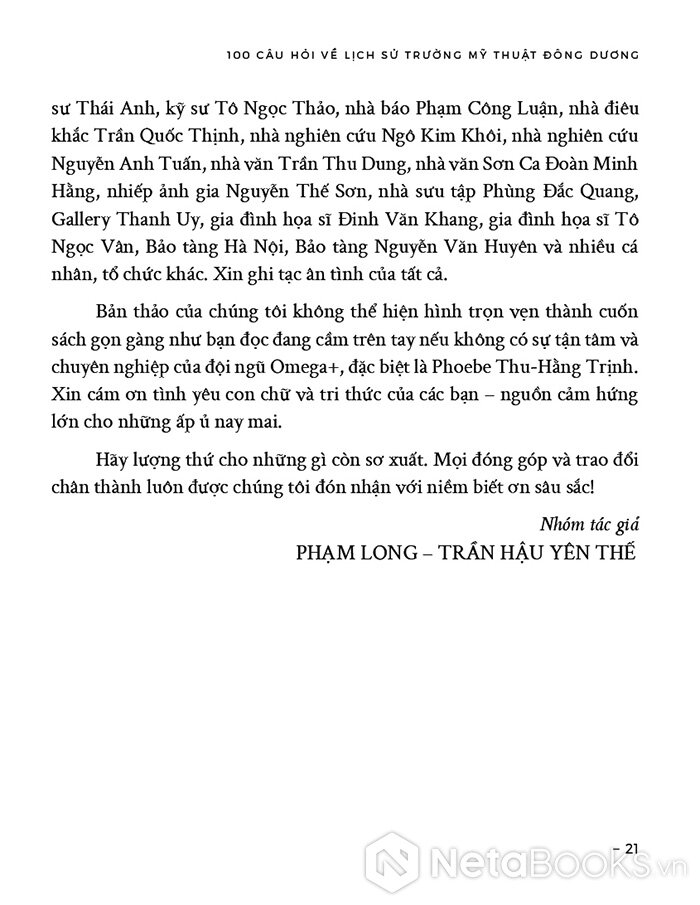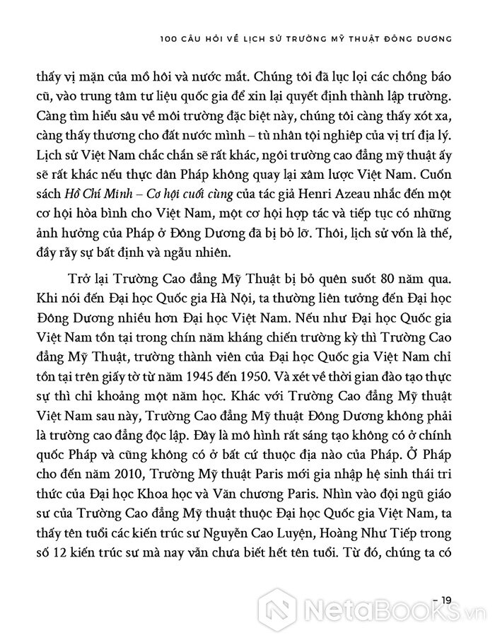 Không ngừng đặt câu hỏi và tìm kiếm câu trả lời, tạo ra một chuỗi những con sóng truy vấn nối tiếp nhau không dứt, không phải để tự động viên, bao biện cho những gì chưa hoàn thiện mà vì chúng tôi tin rằng câu hỏi quan trọng có tầm quan trọng như câu trả lời. Và vì thế, khi hành trình 100 câu hỏi khép lại, dù chắc chắn hiểu rằng vẫn còn đó vô số điều bỏ ngỏ đang chờ tiếp tục được giải đáp, các tác giả hy vọng đã và sẽ truyền cảm hứng để độc giả tự đặt ra những câu hỏi của riêng mình, tiếp tục hành trình khám phá lịch sử của ngôi trường mỹ thuật này.”