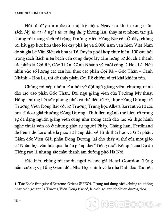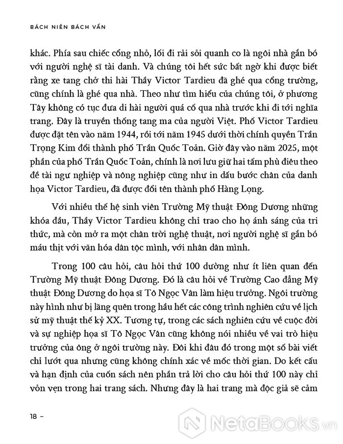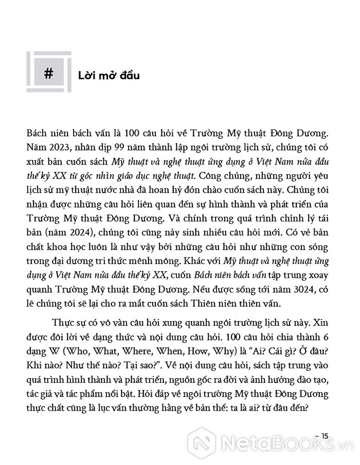 “Bách niên bách vấn: 100 câu hỏi về lịch sử Trường Mỹ Thuật Đông Dương” là một ấn phẩm cô đọng nhưng toàn diện, góp phần vén mở bức màn lịch sử phức tạp của Trường Mỹ thuật Đông Dương (École des Beaux-Arts de l’Indochine), trong suốt quãng thời gian hoạt động 21 năm ngắn ngủi từ năm 1924 đến năm 1945.