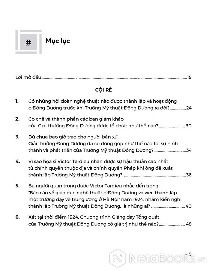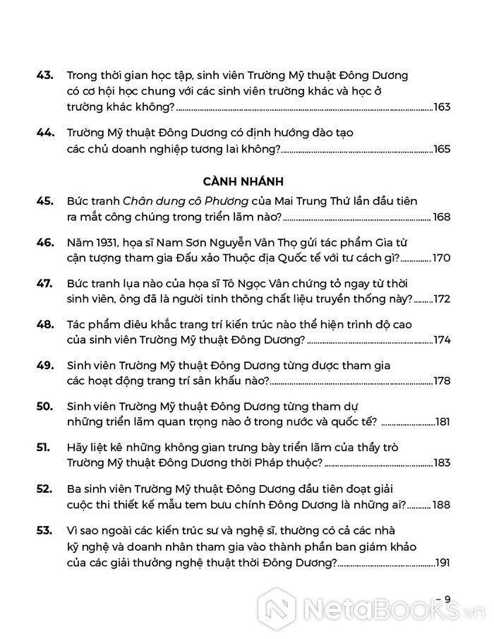 - Phần 3 - Cành Nhánh (24 câu hỏi): Quá trình đào tạo cùng những bước đầu thực hành và làm nghề của sinh viên/ học viên được đào tạo trong Trường Mỹ thuật Đông Dương, các triển lãm đầu tiên cũng những giải thưởng đa lĩnh vực và những biến động xã hội, chính trị khiến Trường phân tách và mở ra nhiều ngã rẽ.