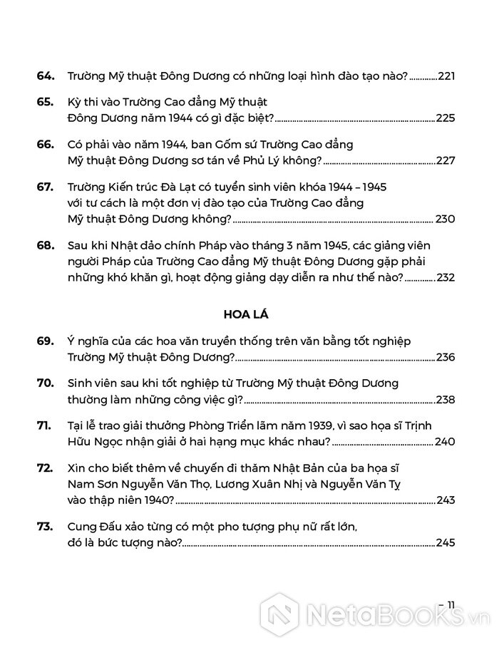 - Phần 4 - Hoa Lá (32 câu hỏi): Những thành tựu mà Trường Mỹ thuật Đông Dương đạt được sau khi đào tạo thành công ra những thế hệ nghệ sĩ-tri thức, sống và làm nghề với đam mê và tài năng để xây dựng nền mỹ thuật Việt.