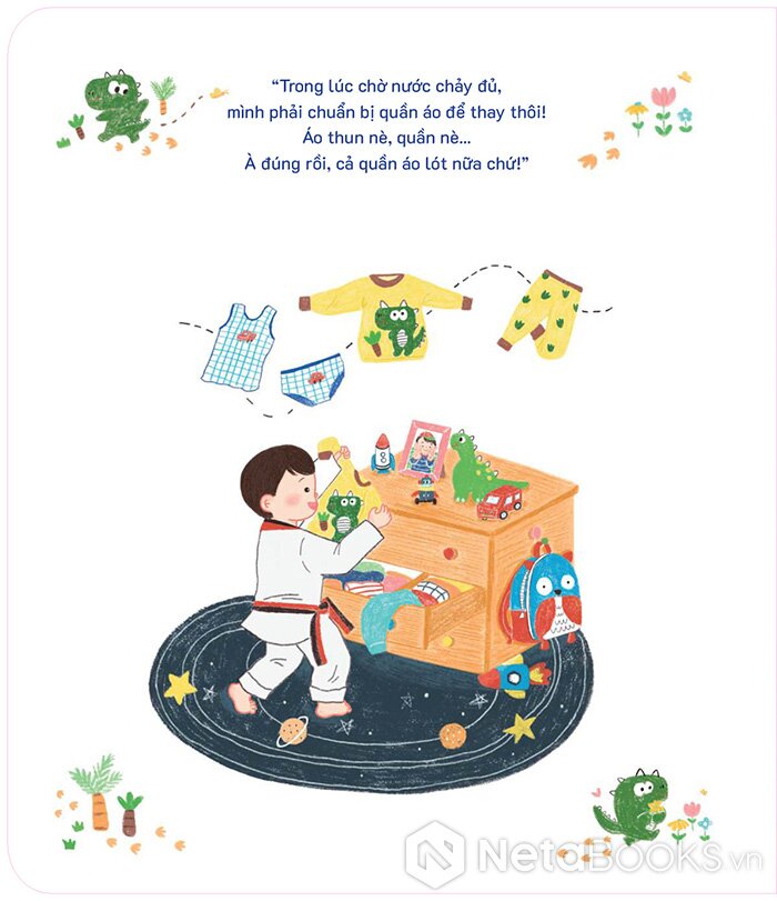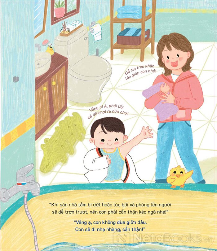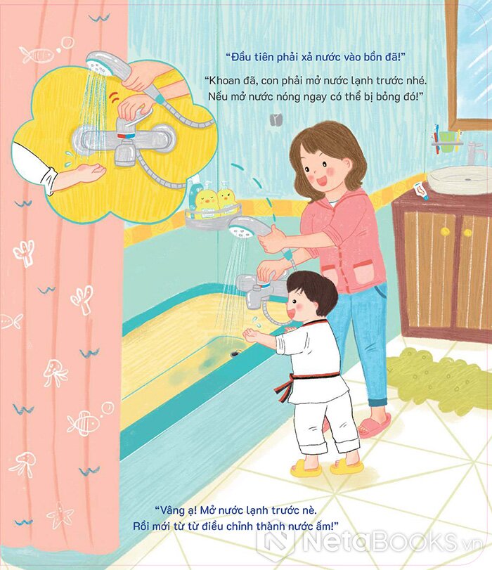 Tắm rửa là một trong những kĩ năng cá nhân mà bất cứ ai cũng đều phải thành thạo. Bé hãy theo dõi câu chuyện và cùng cậu bé trong sách học cách chuẩn bị trước và sau khi tắm, cách gội đầu và vệ sinh thân thế cho thật đúng nhé!