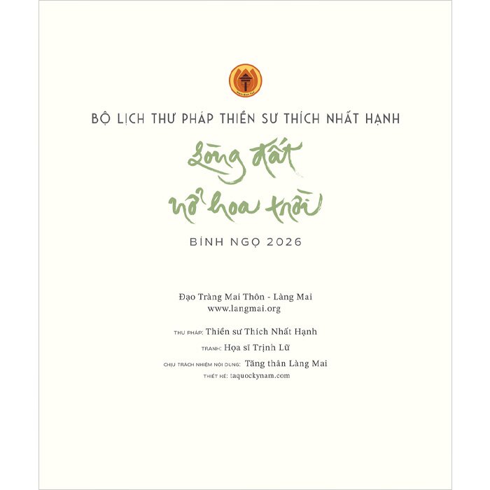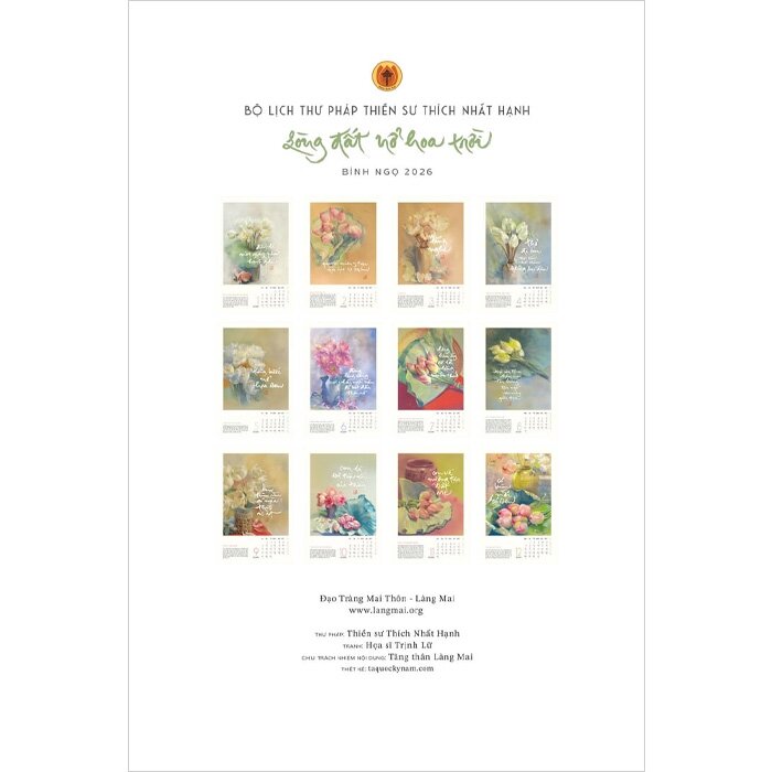 Năm nay, Tăng thân Làng Mai cùng Thái Hà Books trân trọng gửi đến bạn ấn phẩm lịch đặc biệt với chủ đề “Lòng đất nở hoa trời”. Mỗi tờ lịch không chỉ là một mốc thời gian, mà còn là một cánh cửa nhỏ dẫn về chánh niệm - nhắc ta dừng lại, thở sâu và sống thật.