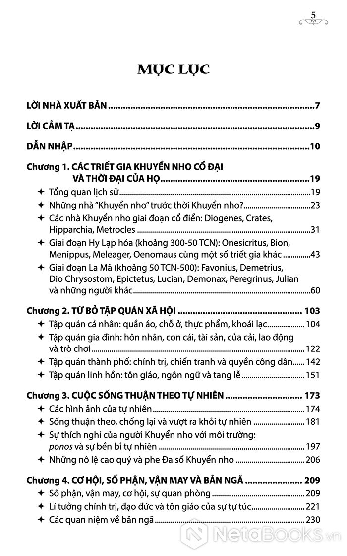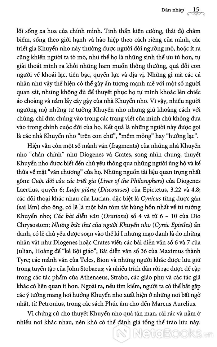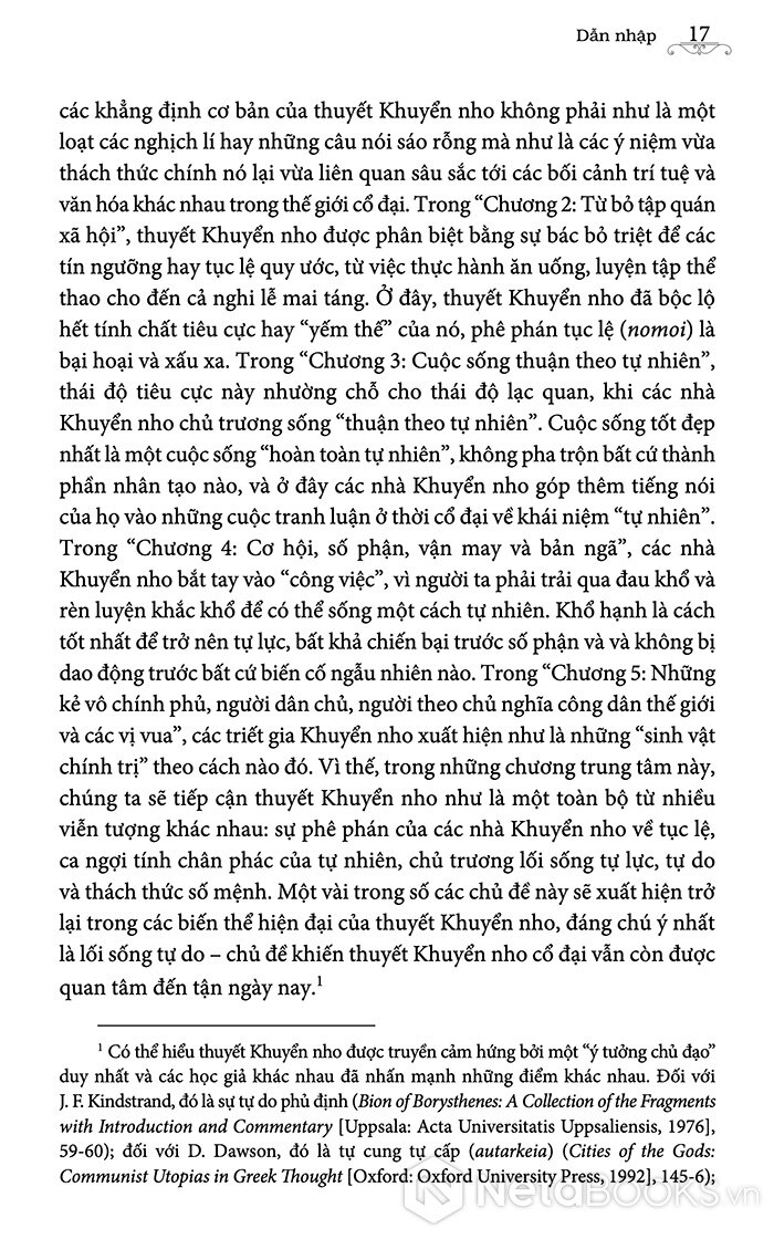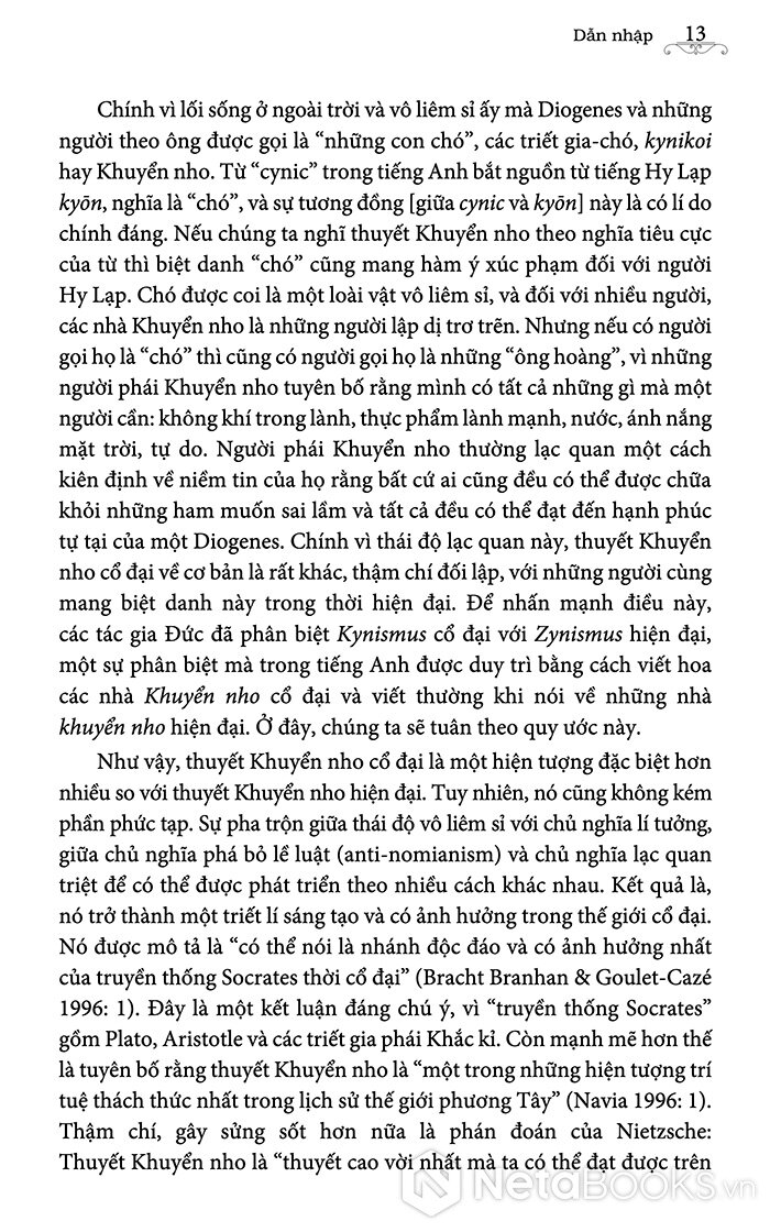 Tiếp cận Khuyển nho qua nhiều chủ đề - từ phê phán các quy ước xã hội, ca ngợi lối sống giản dị thuận theo tự nhiên, đề cao sự tự đủ, đến thái độ thách thức số mệnh và tinh thần tự do - William Desmond mang đến một bức tranh khái quát sinh động về một trường phái tư tưởng có ảnh hưởng sâu rộng trong lịch sử và vẫn tiếp tục thu hút sự quan tâm cho đến ngày nay.