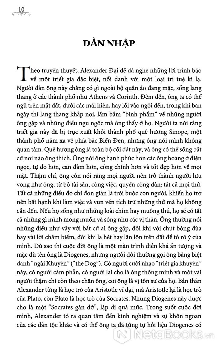Lối sống ấy được thể hiện rõ nét nhất qua nhân vật Diogenes - người được mệnh danh là “gã Khuyển” - cùng những môn đồ của ông, thường được gọi là “các triết gia-chó”, kunikoi, hay Cynics. Nổi loạn, kiên quyết, đôi khi gai góc nhưng cũng đầy dí dỏm và giàu sức tưởng tượng, họ là những nhân vật đặc biệt và sống động bậc nhất của thế giới cổ đại.