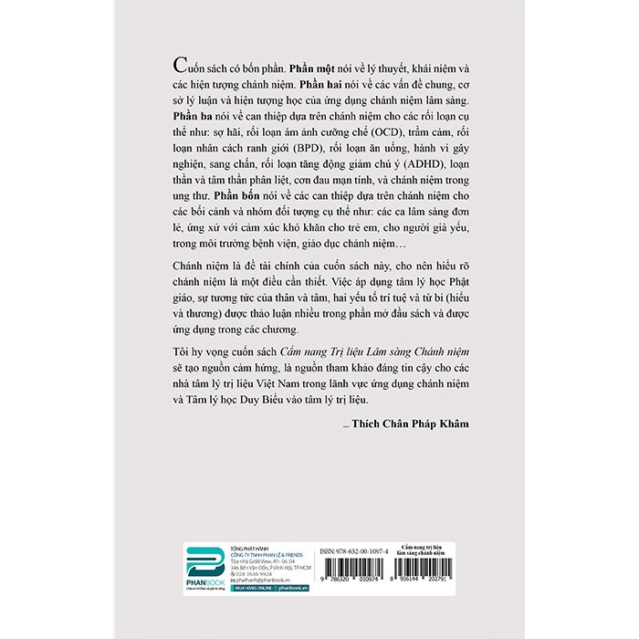 Tôi hy vọng cuốn sách Cẩm nang Trị liệu Lâm sàng Chánh niệm sẽ tạo nguồn cảm hứng, là nguồn tham khảo đáng tin cậy cho các nhà tâm lý trị liệu Việt Nam trong lãnh vực ứng dụng chánh niệm và Tâm lý học Duy Biểu vào tâm lý trị liệu.