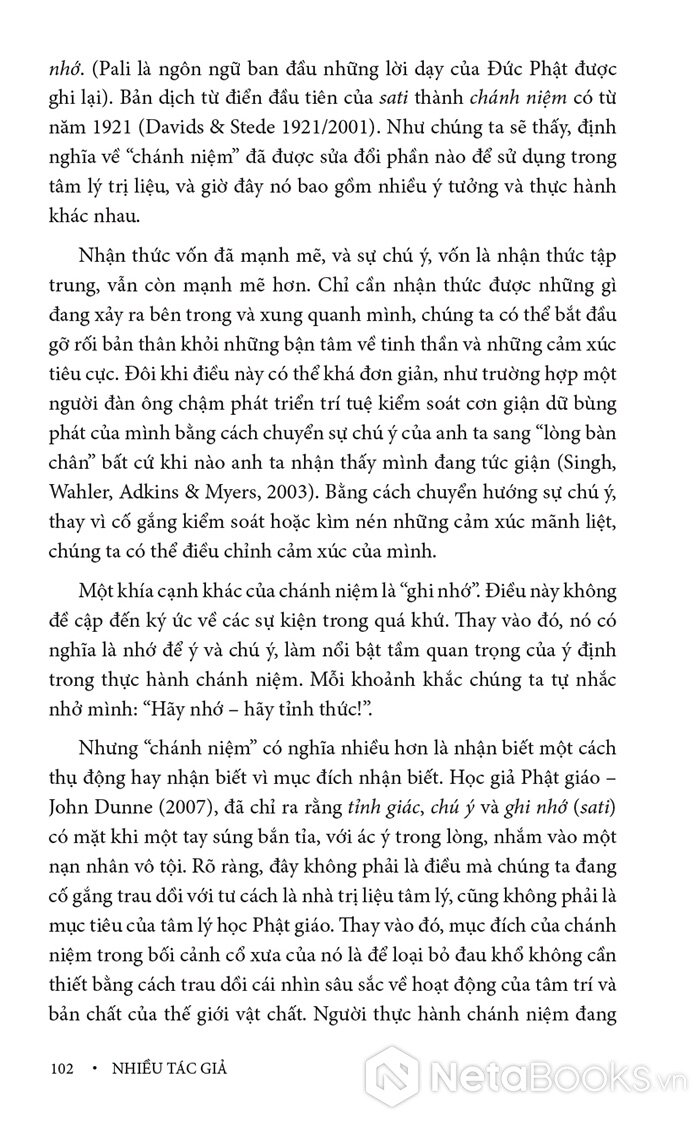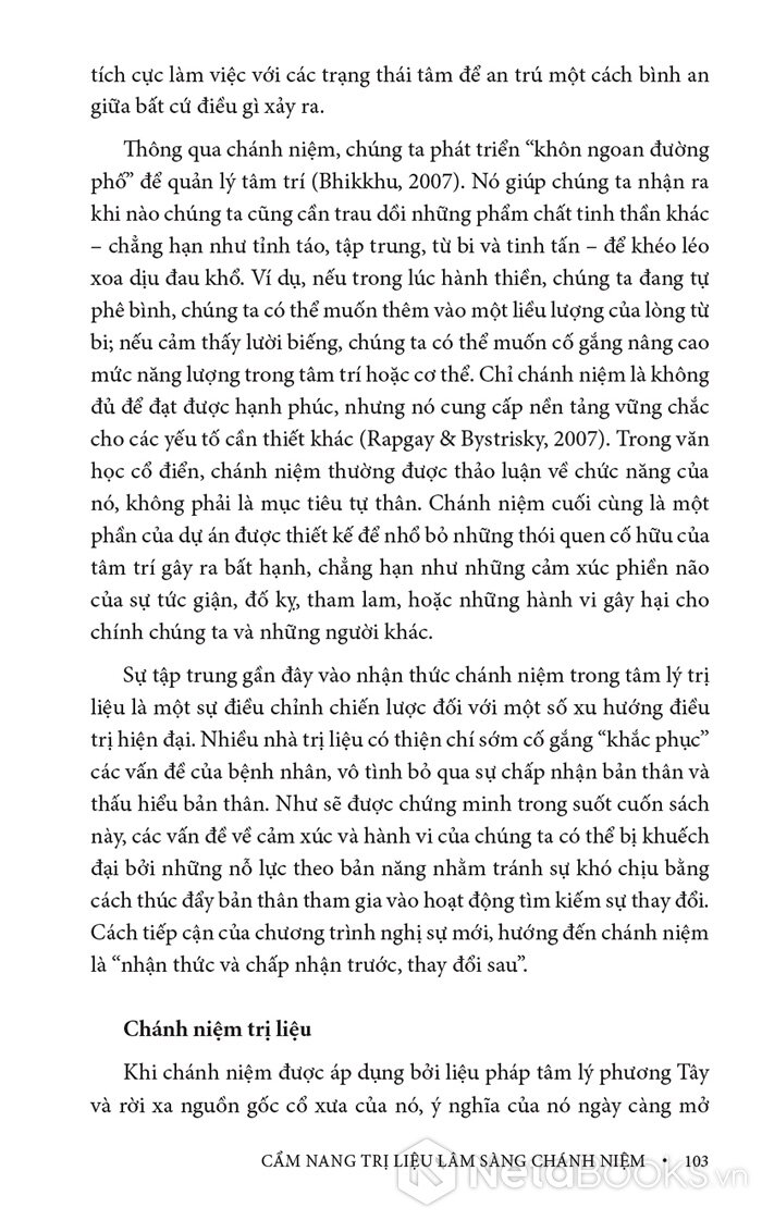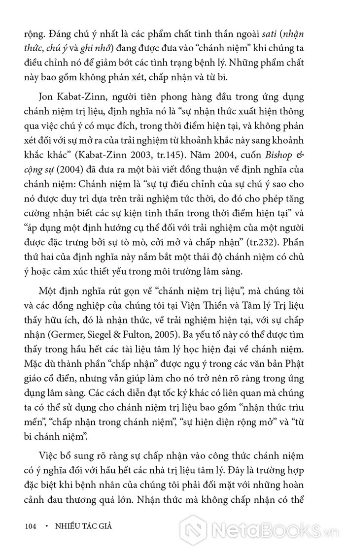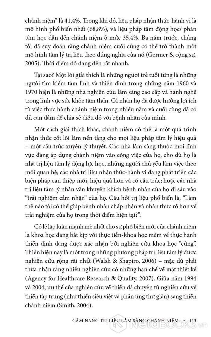 Cuốn sách minh họa mối liên hệ giữa lý thuyết, khoa học và ứng dụng trị liệu của chánh niệm đối với các vấn đề tâm lý và thể chất, làm nổi bật mối liên hệ giữa những chủ đề này với truyền thống phương Đông.