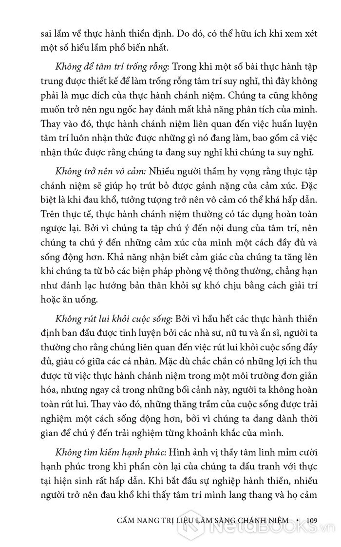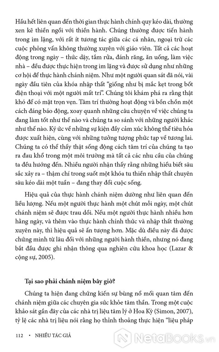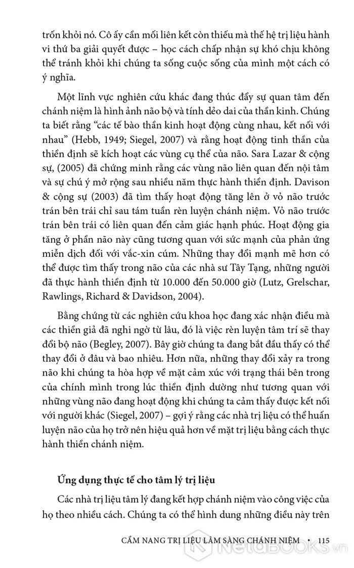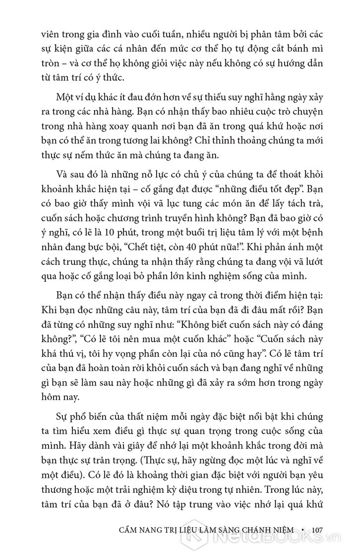 Cuốn sách minh họa mối liên hệ giữa lý thuyết, khoa học và ứng dụng trị liệu của chánh niệm đối với các vấn đề tâm lý và thể chất, làm nổi bật mối liên hệ giữa những chủ đề này với truyền thống phương Đông.