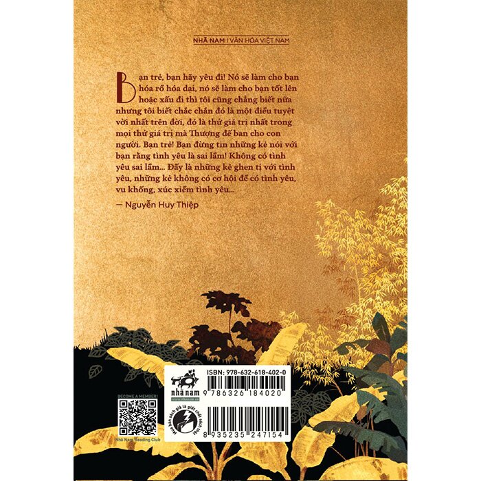 “Bà Hân đưa con gái ra khỏi cửa buồng. Nhi đội khăn vuông, mặc áo bông, khoác tay nải, rực rỡ như một đóa quỳnh trong đêm. Bà Hân gói cả gói vàng bạc sính lễ mà ông Cả Giao mang đến giúi vào tay nải cho cô con gái. Nhi òa khóc, quỳ xuống trước mặt hai ông bà Hân: