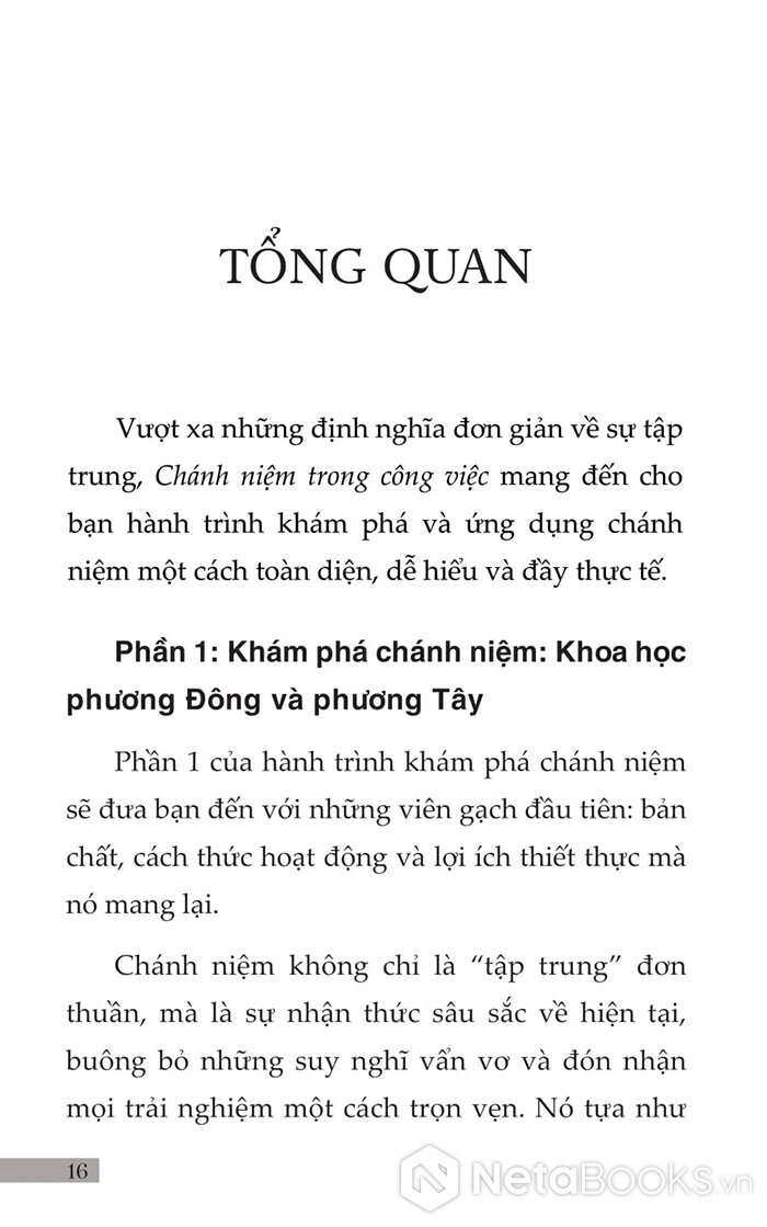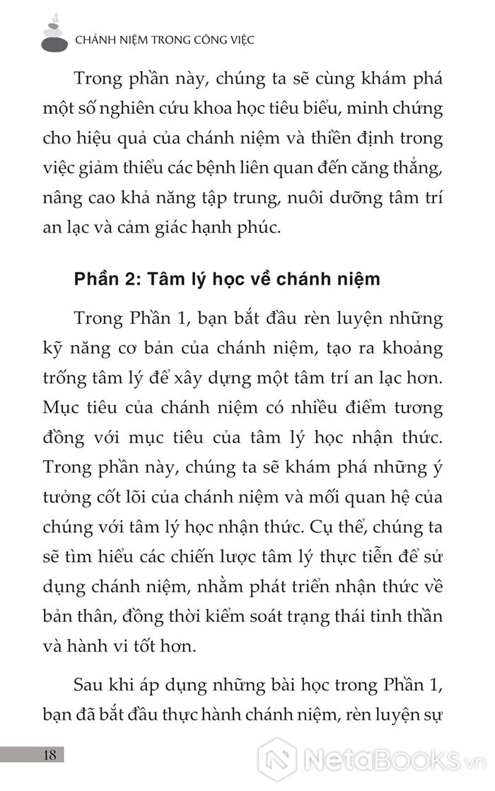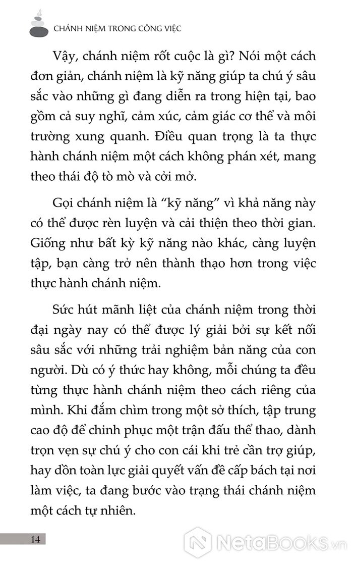 Chánh Niệm Trong Công Việc không tiếp cận chánh niệm như một khái niệm tôn giáo hay lý thuyết siêu hình, mà như một kỹ năng có thể luyện tập, một kỹ năng giúp ta “thức tỉnh” khỏi những phản ứng vô thức, để chú tâm, bình tĩnh và hành động sáng suốt hơn trong từng hoàn cảnh.