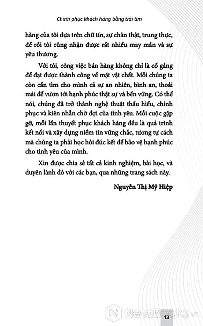 Trong hơn 25 năm làm nghề, tác giả Nguyễn Thị Mỹ Hiệp đã chứng kiến sự thay đổi mạnh mẽ của ngành bán hàng, đặc biệt trong lĩnh vực bảo hiểm nhân thọ. Nhưng xuyên suốt mọi giai đoạn, có một nguyên lý không đổi - người bán hàng chỉ có thể phát triển bền vững nếu xây dựng được niềm tin thật với khách hàng, từ chính sự chân thành, chính trực và hiểu biết chuyên môn của mình.