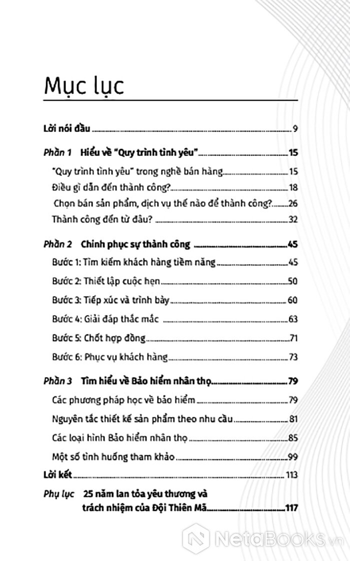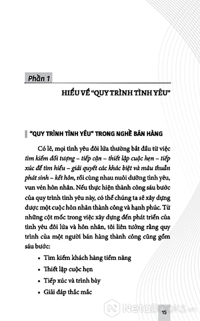 Có đến 71% quyết định mua hàng đến từ sự quý mến và tin tưởng dành cho người bán. Điều đó lý giải vì sao tác giả xem trọng “quy trình tình yêu” - một mô hình vận hành bán hàng gồm sáu bước: tìm khách hàng - hẹn gặp - tiếp xúc - giải đáp - chốt hợp đồng - phục vụ.