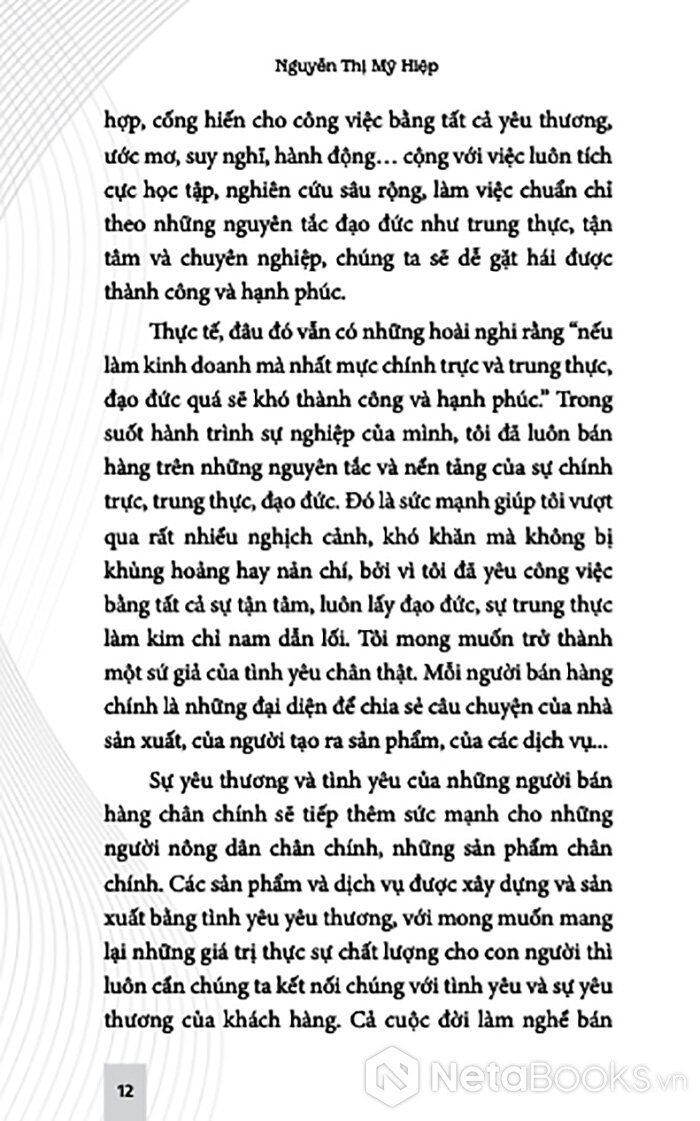 Ngược lại, bà khẳng định: người bán hàng càng chính trực, càng am hiểu sản phẩm, càng đặt lợi ích khách hàng lên trước, thì càng được khách hàng yêu quý và tin tưởng lâu dài. Đây cũng là triết lý đứng sau đội ngũ Thiên Mã - nơi tác giả nhiều lần nhắc đến trong những trang cuối: xây dựng văn hóa làm việc có trách nhiệm, nhân văn và tiêu chuẩn nghề nghiệp rõ ràng.