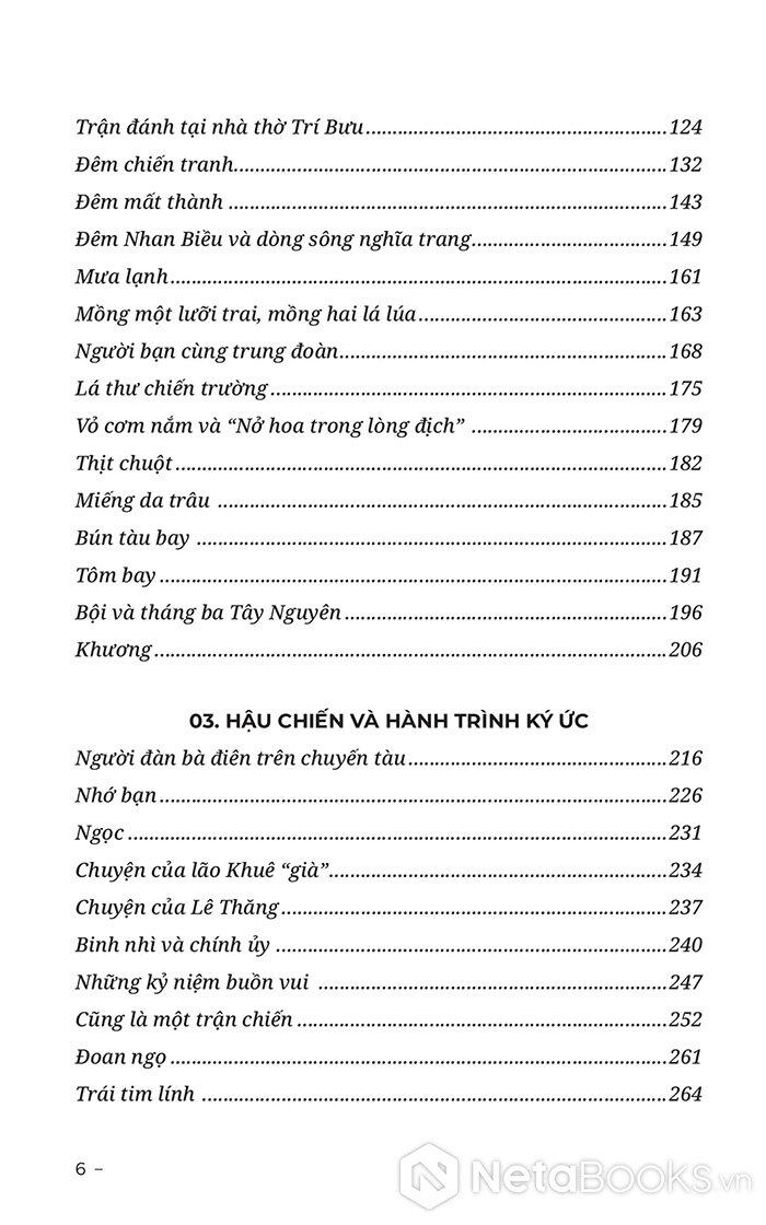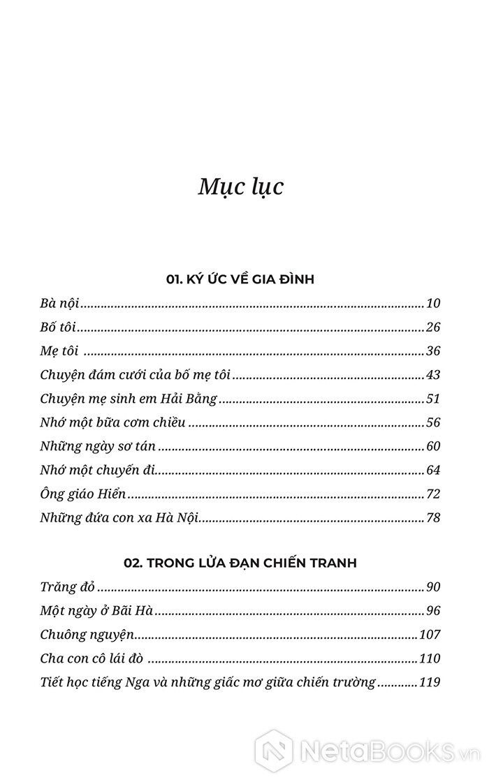 Cấu trúc cuốn sách gồm ba phần lớn, được tổ chức theo mạch “ký ức về gia đình - chiến trường - hậu chiến”: