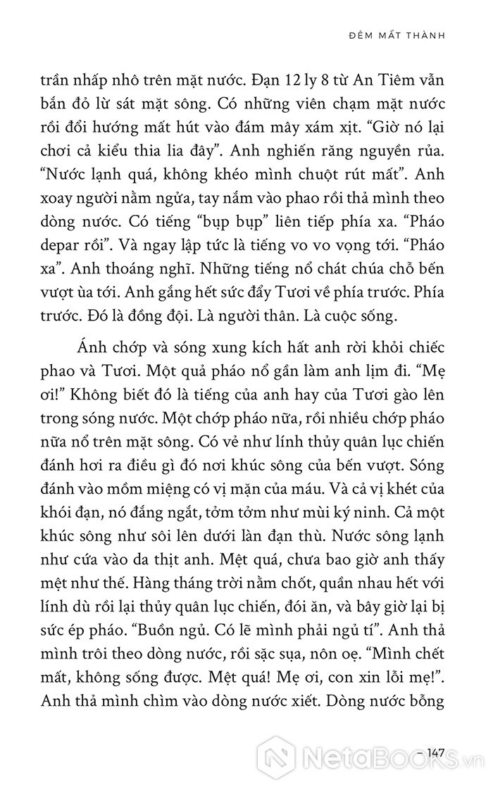 “Cả một khúc sông như sôi lên dưới làn đạn thù. Nước sông lạnh như cứa vào da thịt anh. Mệt quá, chưa bao giờ anh thấy mệt như thế. Hàng tháng trời nằm chốt, quần nhau hết với lính dù rồi lại thủy quân lục chiến, đói ăn, và bây giờ lại bị sức ép pháo. “Buồn ngủ. Có lẽ mình phải ngủ tí”. Anh thả mình trôi theo dòng nước, rồi sặc sụa, nôn oẹ. “Mình chết mất, không sống được. Mệt quá! Mẹ ơi, con xin lỗi mẹ!” Anh thả mình chìm vào dòng nước xiết. Dòng nước bỗng trở nên êm ái, ôm anh vào lòng. Anh thấy mình đang là đứa trẻ, hè năm nào vượt sông Hồng sang Bãi Giữa hái ngô. Anh nhớ mùi ngô nướng nồng nàn, nhớ tiếng reo của bọn cái Hà, cái Tuyết khi nhận bắp ngô nóng hổi anh dúi cho. Anh lại thấy mình đang chân trần chạy trên bờ đê, kéo theo cái diều của một thời thơ bé...