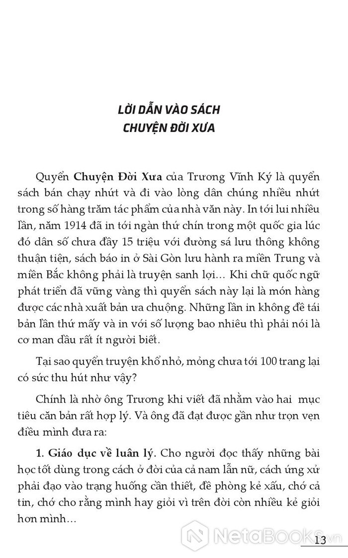 Quyển Chuyện Đời Xưa của Trương Vĩnh Ký là quyển sách bán chạy nhất và đi vào lòng dân chúng nhiều nhất trong số hàng trăm tác phẩm của nhà văn này. In đi in lại nhiều lần, năm 1914 đã in tới 9000 bản trong một quốc gia lúc đó dân số chưa đầy 15 triệu với đường sá lưu thông không thuận tiện, sách báo in ở Sài Gòn lưu hành ra Trung và Bắc không phải là chuyện sinh lợi… Khi chữ Quốc ngữ phát triển đã vững vàng thì quyển sách này lại là món hàng được các nhà xuất bản ưa chuộng.