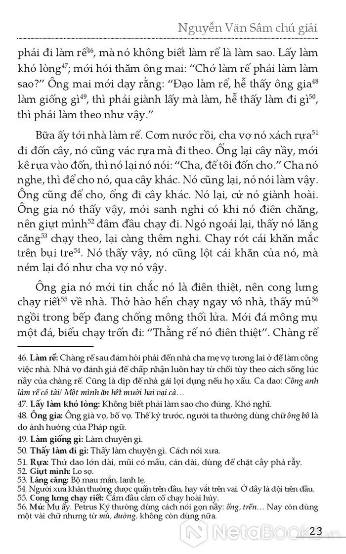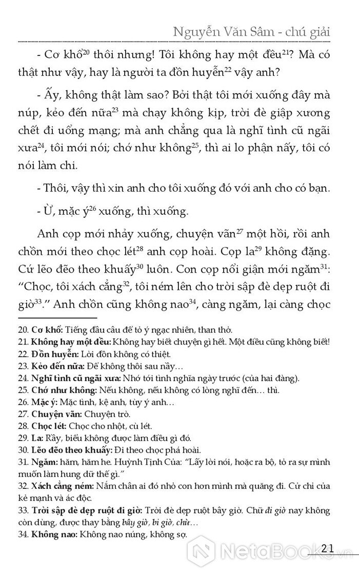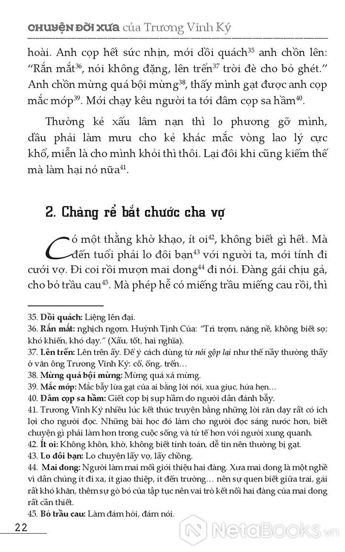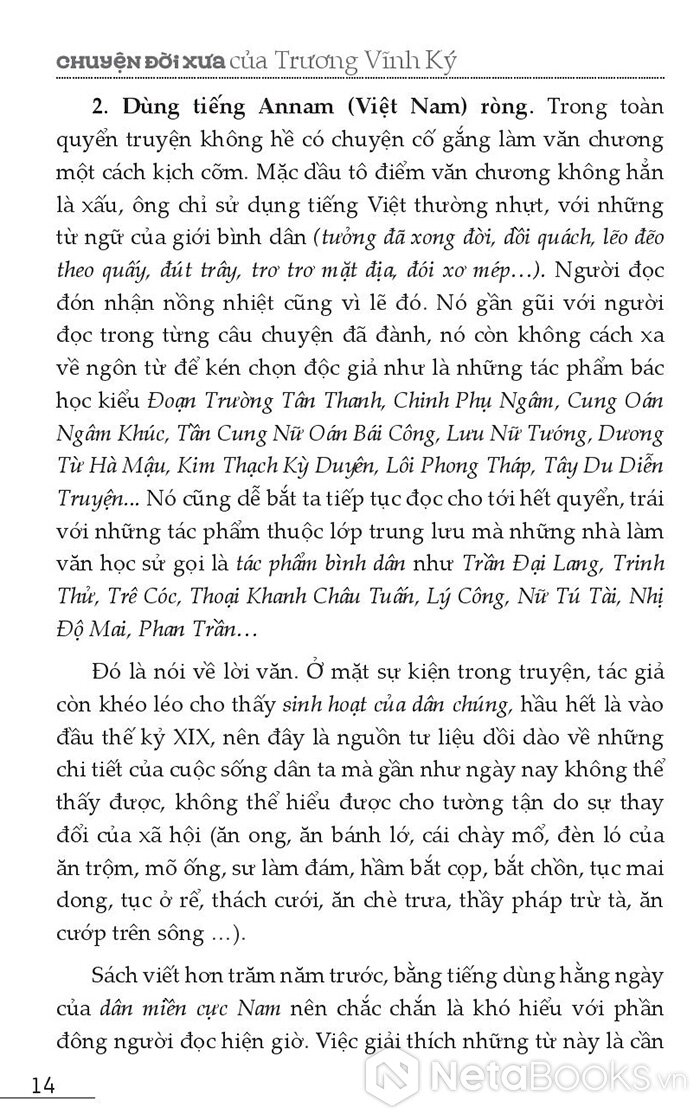 2. Dùng tiếng Annam (Việt Nam) ròng. Trong toàn quyển truyện không hề có chuyện cố gắng làm văn chương một cách kịch cỡm. Mặc dù tô điểm văn chương không hẳn là xấu, ông chỉ sử dụng tiếng Việt thường nhật, với những từ ngữ của giới bình dân (tưởng đã xong đời, dồi quách, lẽo đẽo theo quấy, đút trây, trơ trơ mặt địa, đói xơ mép…). Người đọc đón nhận nồng nhiệt cũng vì lẽ đó. Nó gần gũi với người đọc trong từng câu chuyện đã đành, nó còn không cách xa về ngôn từ để kén chọn độc giả như là những tác phẩm bác học kiểu Đoạn Trường Tân Thanh, Chinh Phụ Ngâm, Cung Oán Ngâm Khúc, Tần Cung Nữ Oán Bái Công, Lưu Nữ Tướng, Dương Từ Hà Mậu, Kim Thạch Kỳ Duyên, Lôi Phong Tháp, Tây Du Diễn Truyện... Nó cũng dễ bắt ta tiếp tục đọc cho tới hết quyển, trái với những tác phẩm thuộc lớp trung lưu mà những nhà làm văn học sử gọi là tác phẩm bình dân như Trần Đại Lang, Trinh Thử, Trê Cóc, Thoại Khanh Châu Tuấn, Lý Công, Nữ Tú Tài, Nhị Độ Mai, Phan Trần…