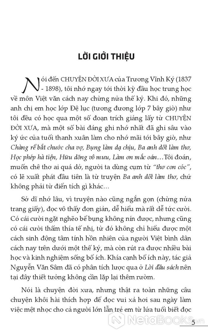 Chuyện đời xưa là cuốn sách tổng hợp những câu chuyện khôi hài thích hợp để đọc vui xả hơi sau ngày làm việc mệt nhọc cho cả người lớn lẫn trẻ em. Ngoài ra, cuốn sách này dành cho những người chú ý tìm hiểu/nghiên cứu ngôn ngữ - văn chương Nam Bộ, hoặc biên soạn từ điển tiếng Việt, cũng phải cần đọc nó, vì bên trong chứa đựng rất nhiều tiếng địa phương độc đáo của miền Nam nước Việt, một thứ văn liệu quý hiếm xác thực để làm việc.