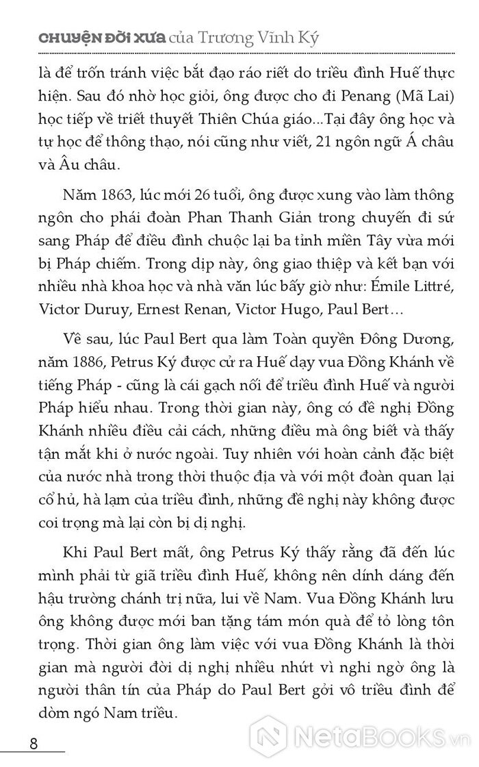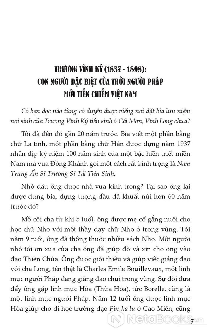 Trương Vĩnh Ký (tên hồi nhỏ là Trương Chánh Ký, 1837 - 1898): CON NGƯỜI ĐẶC BIỆT CỦA THỜI NGƯỜI PHÁP MỚI TIẾN CHIẾM VIỆT NAM Mồ côi cha từ khi 5 tuổi, ông được mẹ cố gắng nuôi cho học chữ Nho với một thầy dạy chữ Nho ở trong vùng. Tới năm 9 tuổi, ông đã thông thuộc nhiều sách Nho. Một người nhớ tới ơn xưa của cha ông đã giúp đỡ và xin cho ông vào đạo Thiên Chúa. Sau đó, ông có tên là Jean-Baptiste Pétrus Trương Chánh Ký, sau này đổi tên đệm là Petrus Trương Vĩnh Ký, viết và gọi tắt là Petrus Ký. Ông được giới thiệu và giúp việc giảng đạo với cha Long, tên thật là Charles Emile Bouillevaux, một linh mục người Pháp đang giảng đạo chui trong vùng. Sự đời đưa đẩy ông gặp linh mục Hòa (Thừa Hòa), tức Borelle, cũng là một linh mục người Pháp. Ông học hai năm ở giáo đường Cái Nhum, ba năm ở trường đạo Pônhalư (Campuchia) và tám năm ở chủng viện Dulaima (Penang, Malaysia).