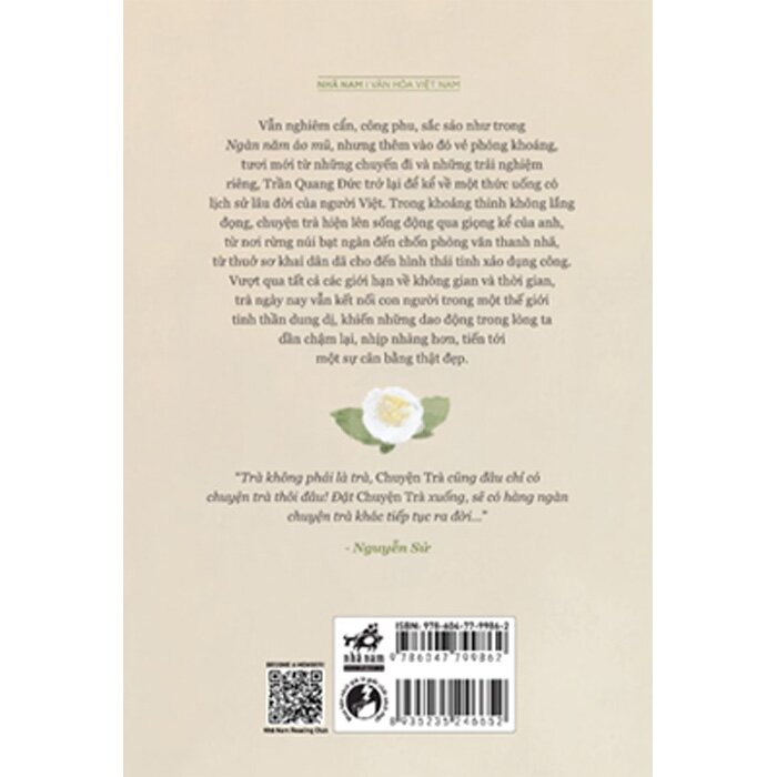 Vẫn nghiêm cẩn, công phu, sắc sảo như trong Ngàn năm áo mũ, nhưng thêm vào đó vẻ phóng khoáng, tươi mới từ những chuyến đi và những trải nghiệm riêng, Trần Quang Đức trở lại để kể về một thức uống có lịch sử lâu đời của người Việt. Trong khoảng thinh không lắng đọng, câu chuyện trà hiện lên qua giọng kể của anh, từ nơi rừng núi bạt ngàn đến chốn phòng văn thanh nhã, từ thuở sơ khai dân dã cho đến hình thái tinh xảo dụng công. Vượt qua tất cả các giới hạn về không gian và thời gian, trà ngày nay vẫn kết nối con người trong một thế giới tinh thần dung dị, khiến những dao động trong lòng ta dần chậm lại, nhịp nhàng hơn, tiến tới một sự cân bằng thật đẹp.