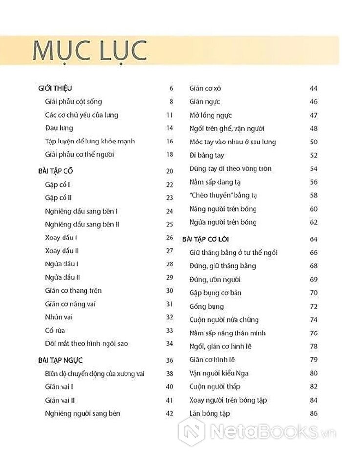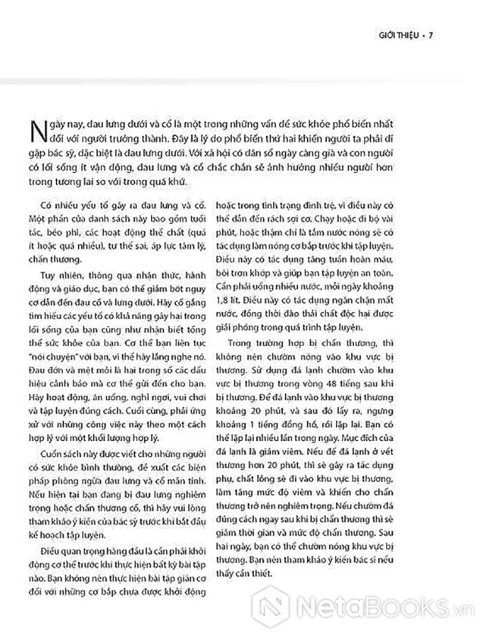 Sách đưa ra các các biện pháp phòng ngừa đau lưng và cổ mãn tính bằng cách hướng dẫn cách tập các bài tập cổ, bài tập ngực, bài tập cơ lõi, bài tập thắt lưng, bài tập cho thân dưới cùng sự phối hợp các bài tập từ tất cả các bộ phận khác nhau có tác dụng tốt đối với cổ, lưng trên, thắt lưng cột sống…