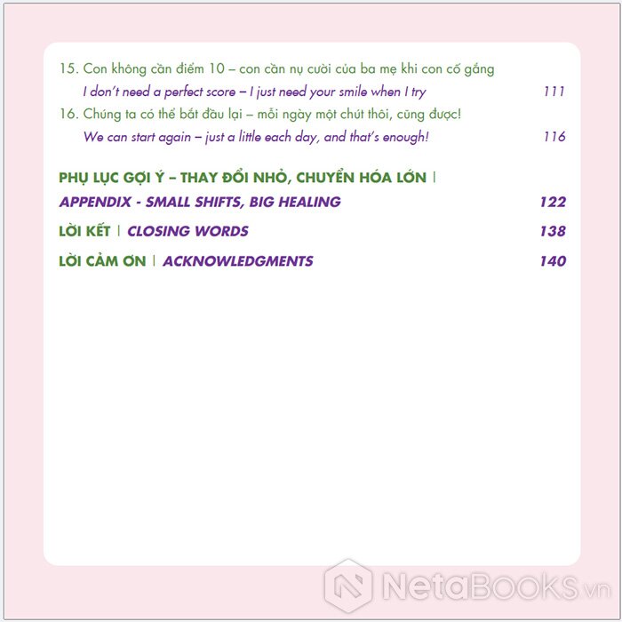 Đây không phải một cuốn sách dạy làm cha mẹ kiểu khuôn mẫu. Không có phán xét, không dọa nạt tội lỗi, không đòi hỏi bạn phải trở nên hoàn hảo. Cuốn sách này giống như một bàn tay dịu dàng đặt lên vai bạn, và nói: “Ba mẹ à, mình có thể bắt đầu lại.”