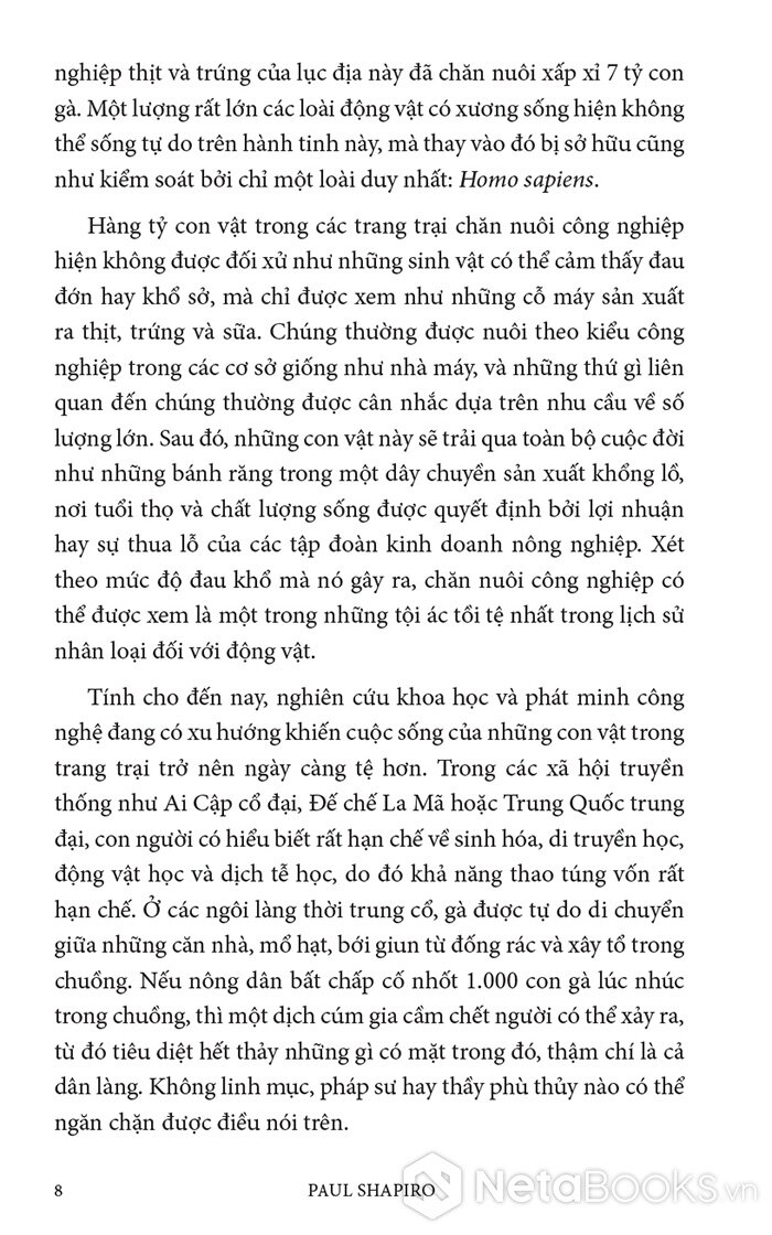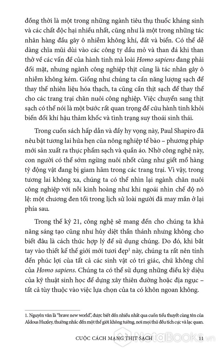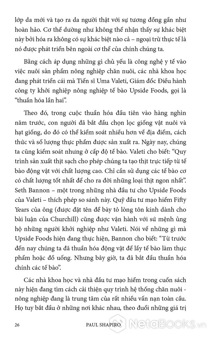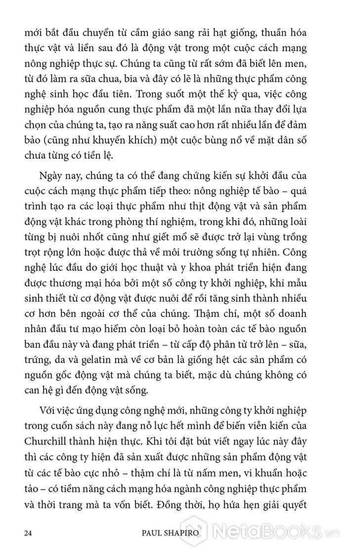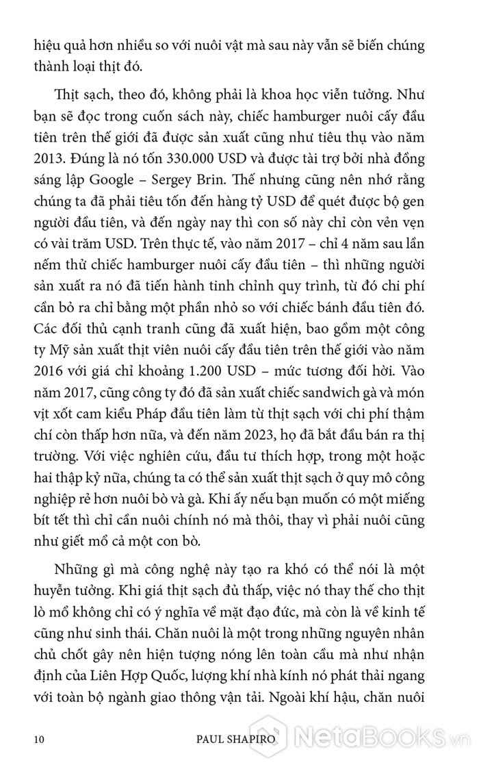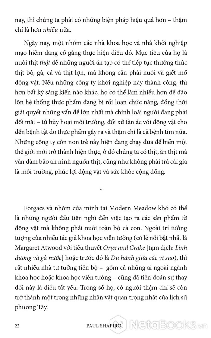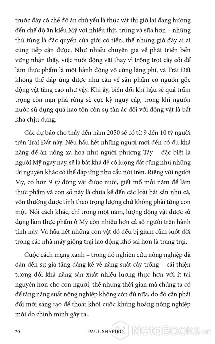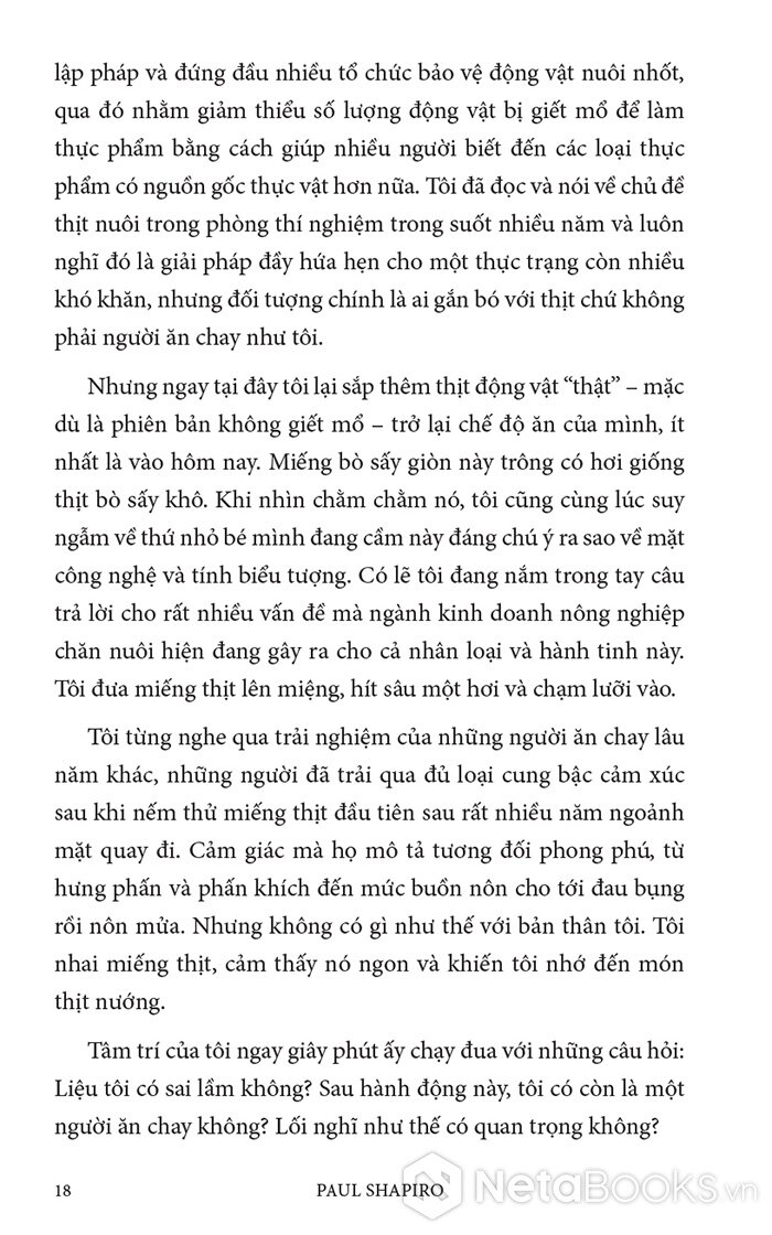 Trong cuốn sách hấp dẫn và đầy hy vọng này, Paul Shapiro đã nêu bật tương lai hứa hẹn của nông nghiệp tế bào - phương pháp mới sản xuất ra thực phẩm sạch và quần áo. Nhờ công nghệ này, con người có thể sớm ngừng nuôi nhốt cũng như giết mổ hàng tỷ động vật đang bị giam hãm trong các trang trại. Vì vậy, trong tương lai không xa, chúng ta có thể nhìn lại ngành chăn nuôi công nghiệp với nỗi kinh hoàng như khi ngoái nhìn chế độ nô lệ: một chương đen tối trong lịch sử loài người đã may mắn ở lại phía sau.