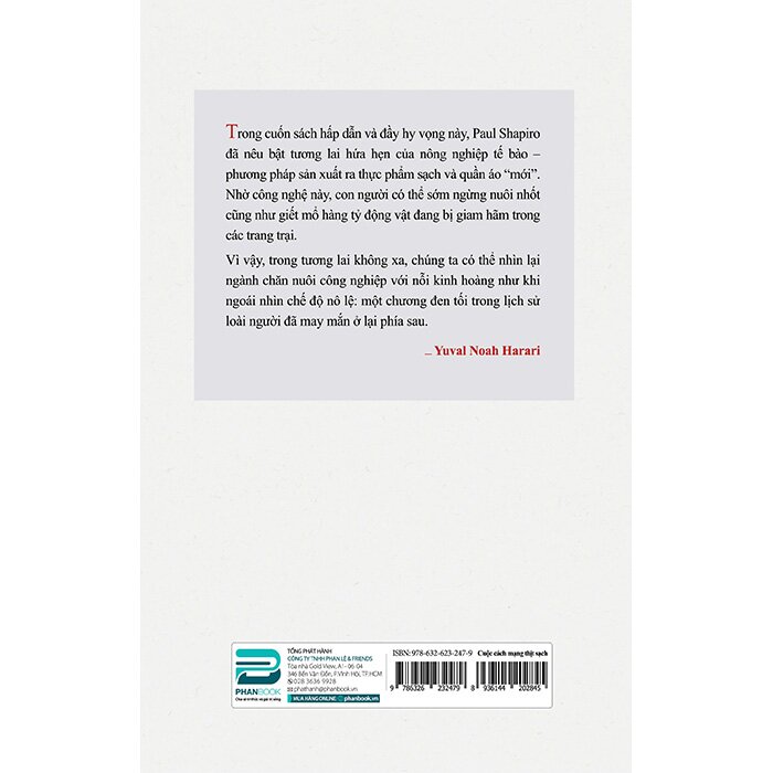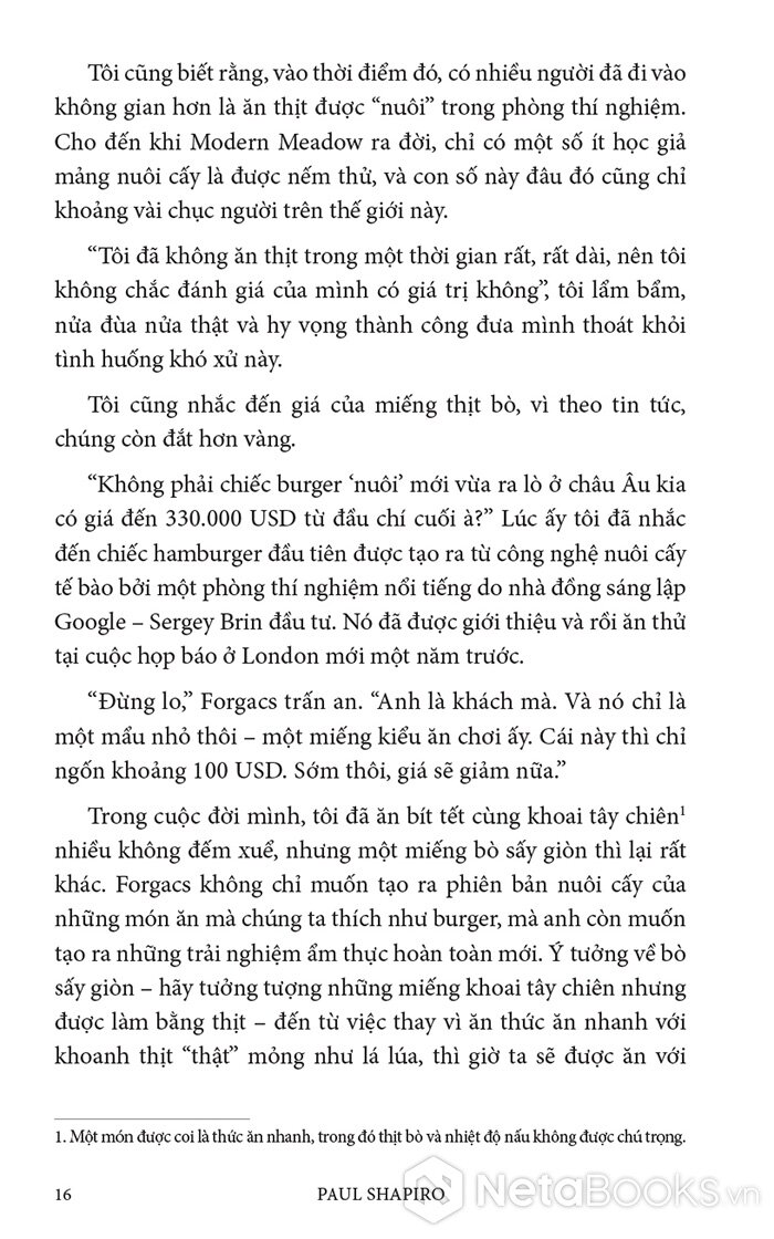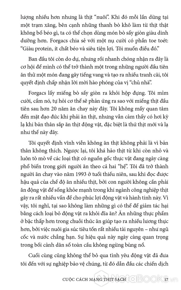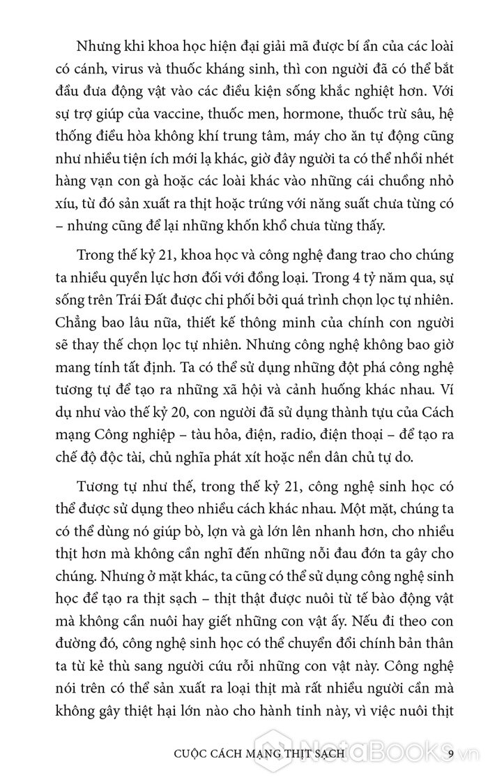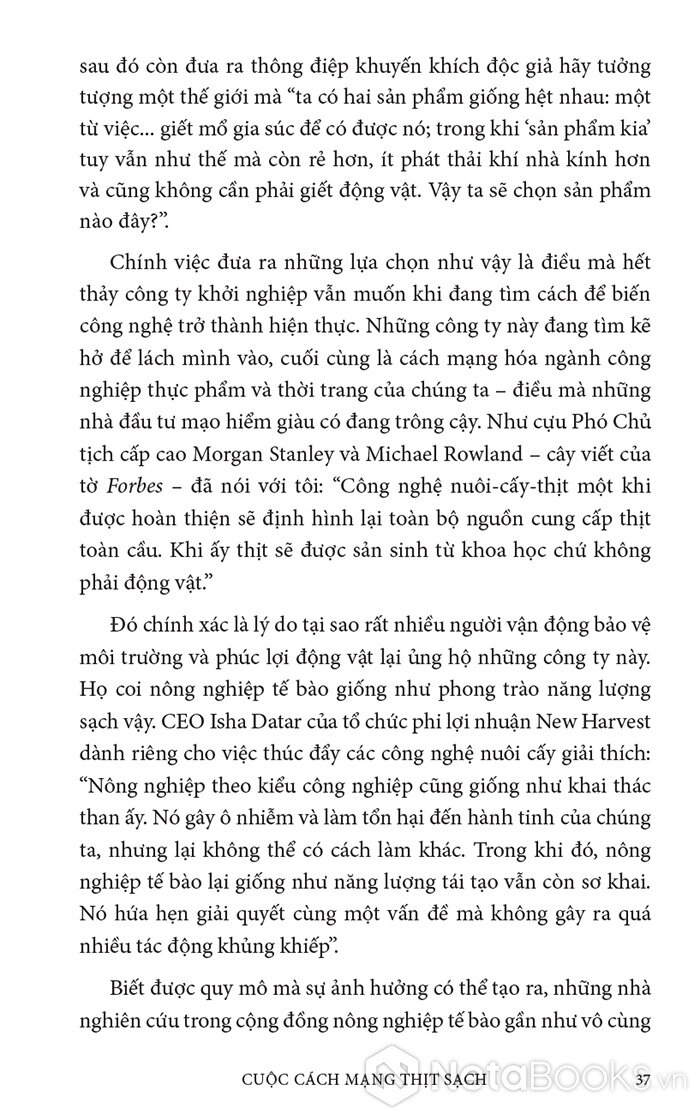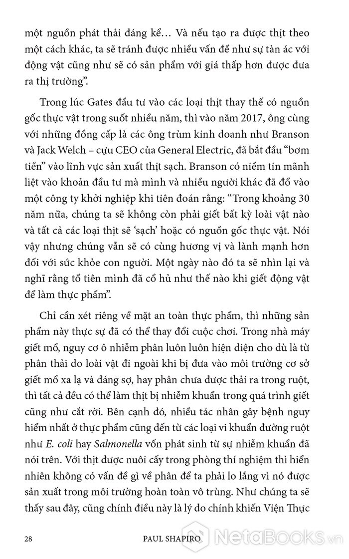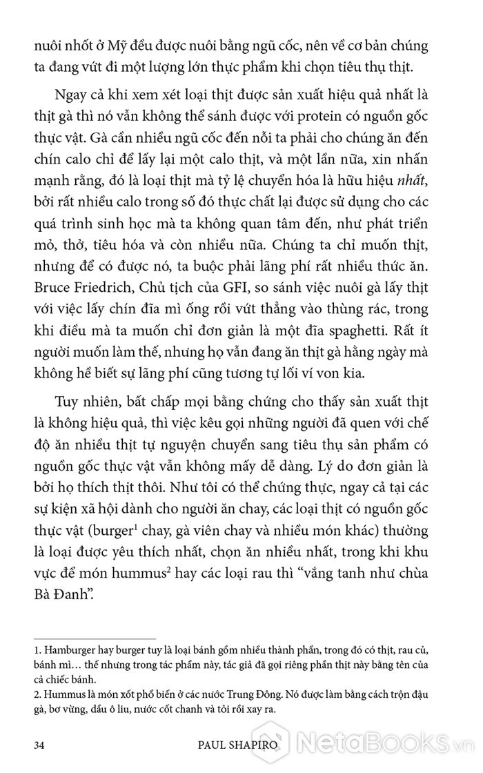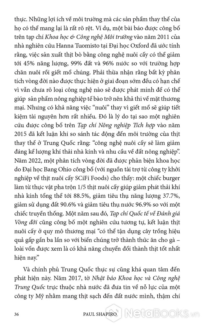 Trong cuốn sách hấp dẫn và đầy hy vọng này, Paul Shapiro đã nêu bật tương lai hứa hẹn của nông nghiệp tế bào - phương pháp mới sản xuất ra thực phẩm sạch và quần áo. Nhờ công nghệ này, con người có thể sớm ngừng nuôi nhốt cũng như giết mổ hàng tỷ động vật đang bị giam hãm trong các trang trại. Vì vậy, trong tương lai không xa, chúng ta có thể nhìn lại ngành chăn nuôi công nghiệp với nỗi kinh hoàng như khi ngoái nhìn chế độ nô lệ: một chương đen tối trong lịch sử loài người đã may mắn ở lại phía sau.