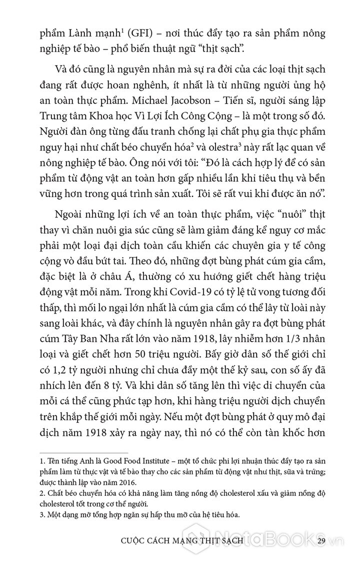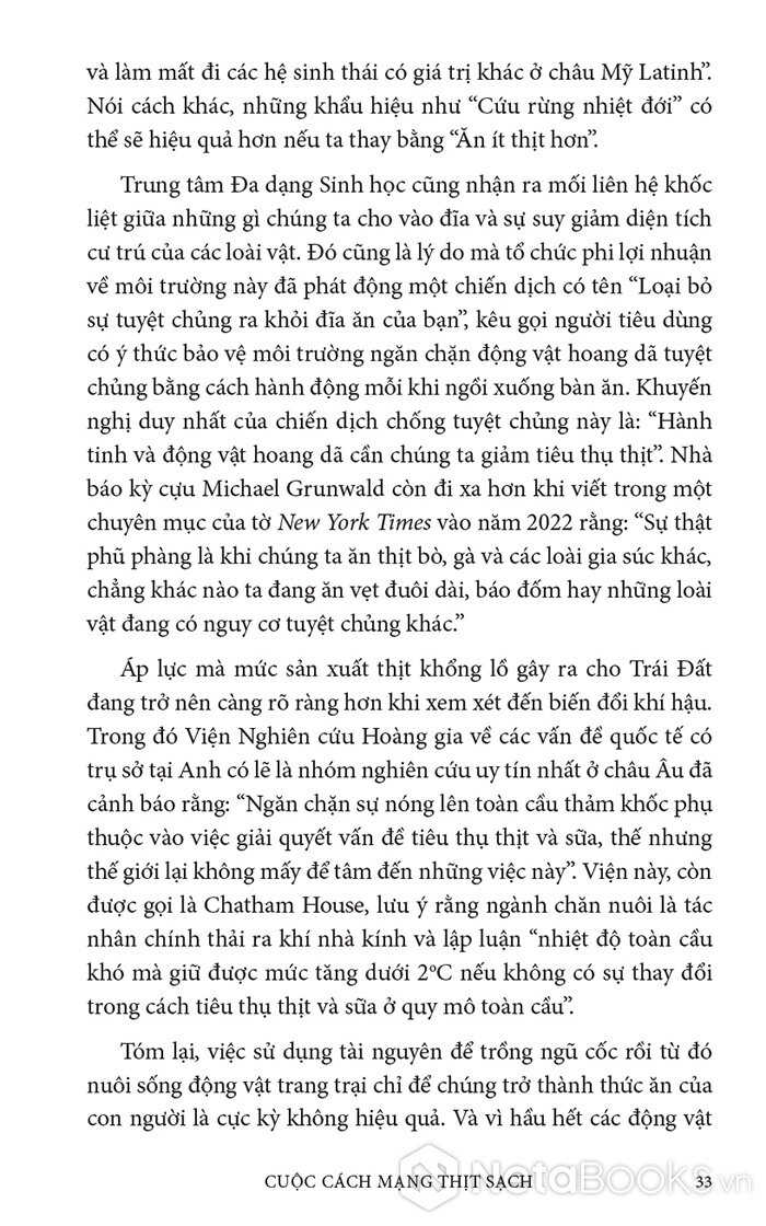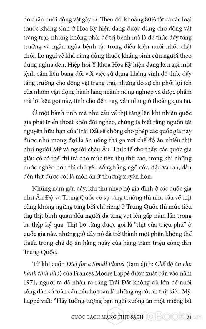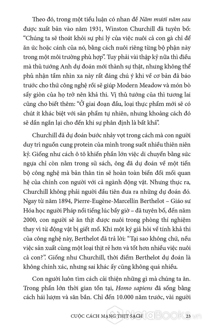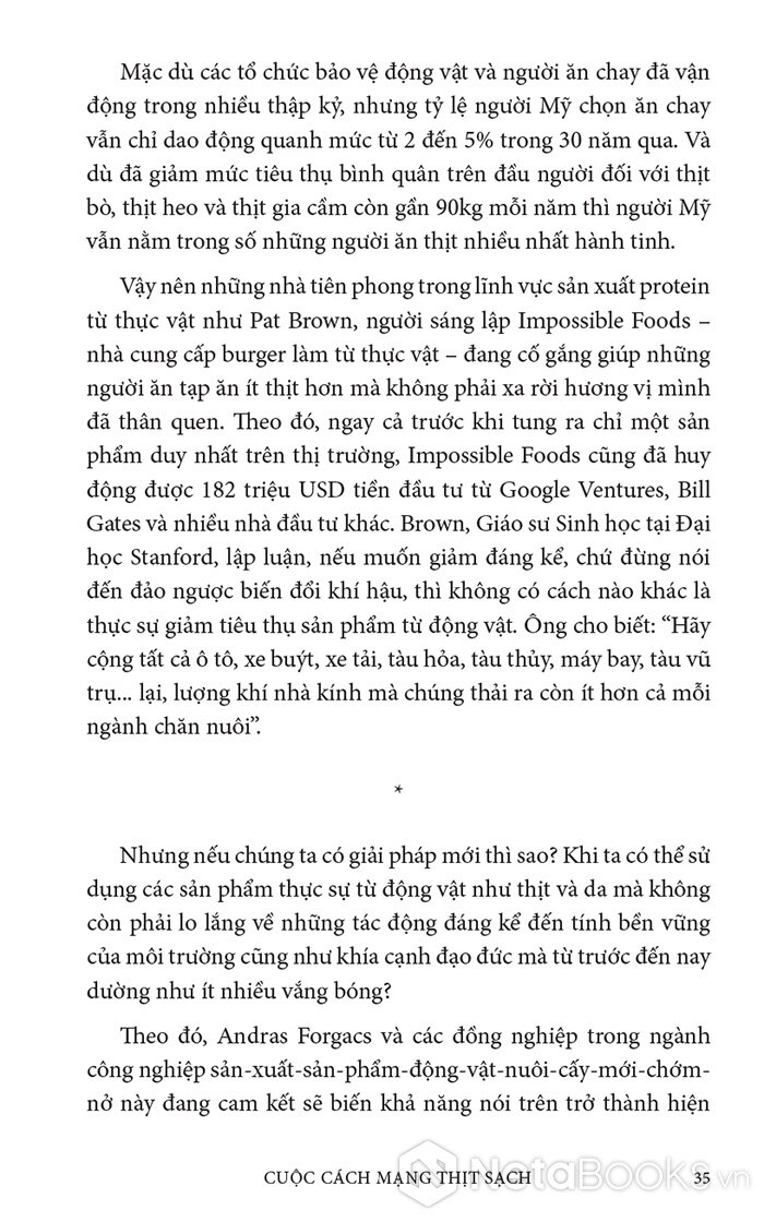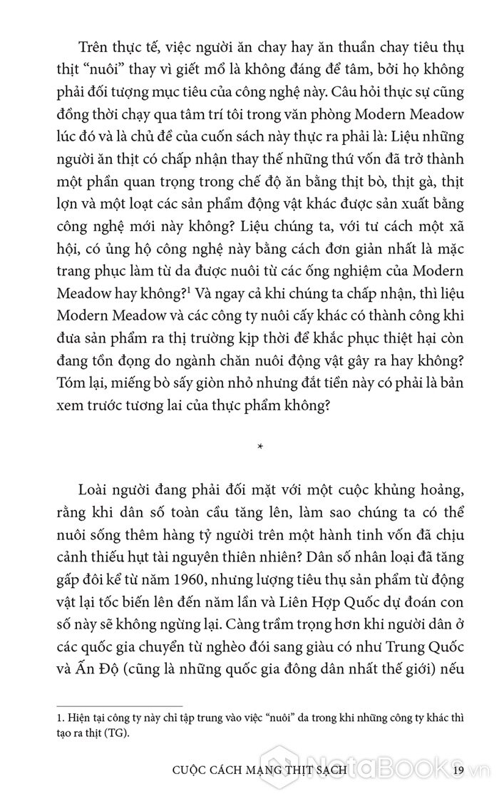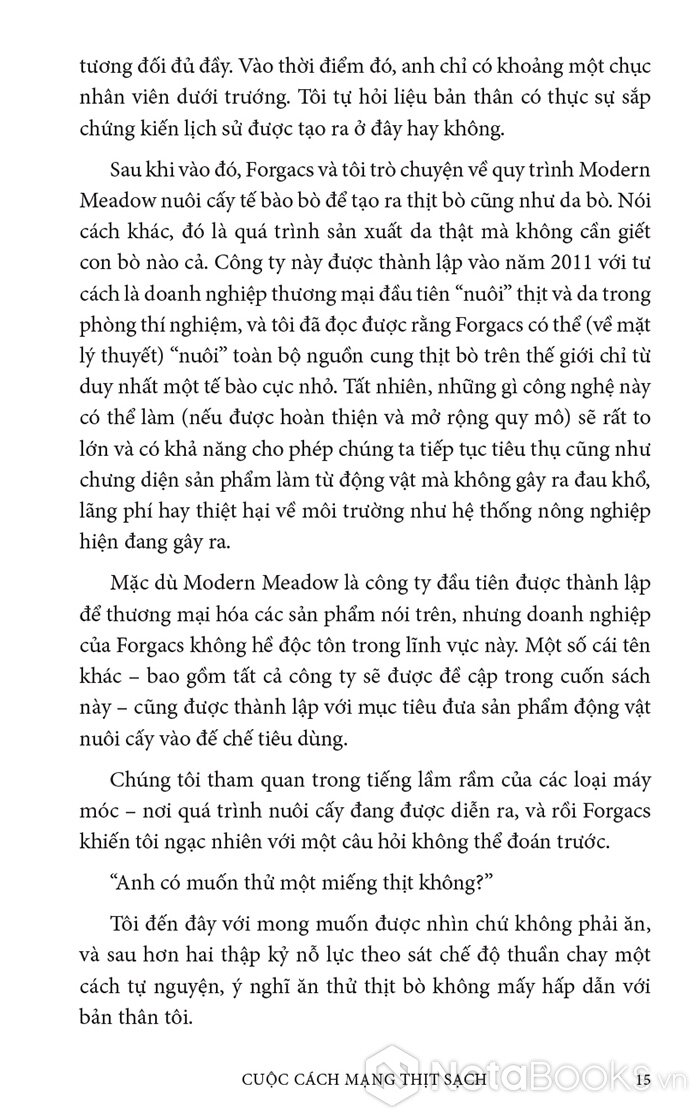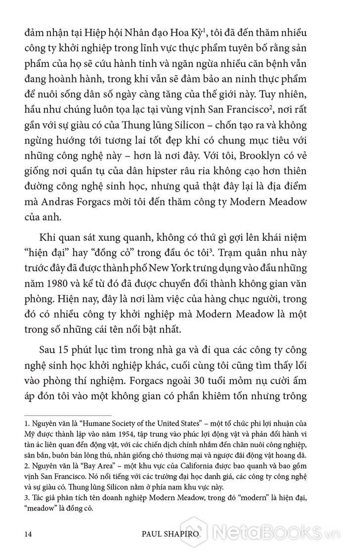 Trong cuốn sách hấp dẫn và đầy hy vọng này, Paul Shapiro đã nêu bật tương lai hứa hẹn của nông nghiệp tế bào - phương pháp mới sản xuất ra thực phẩm sạch và quần áo. Nhờ công nghệ này, con người có thể sớm ngừng nuôi nhốt cũng như giết mổ hàng tỷ động vật đang bị giam hãm trong các trang trại. Vì vậy, trong tương lai không xa, chúng ta có thể nhìn lại ngành chăn nuôi công nghiệp với nỗi kinh hoàng như khi ngoái nhìn chế độ nô lệ: một chương đen tối trong lịch sử loài người đã may mắn ở lại phía sau.