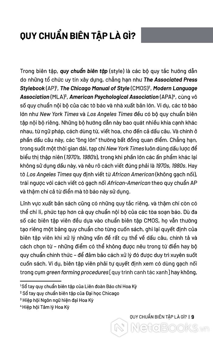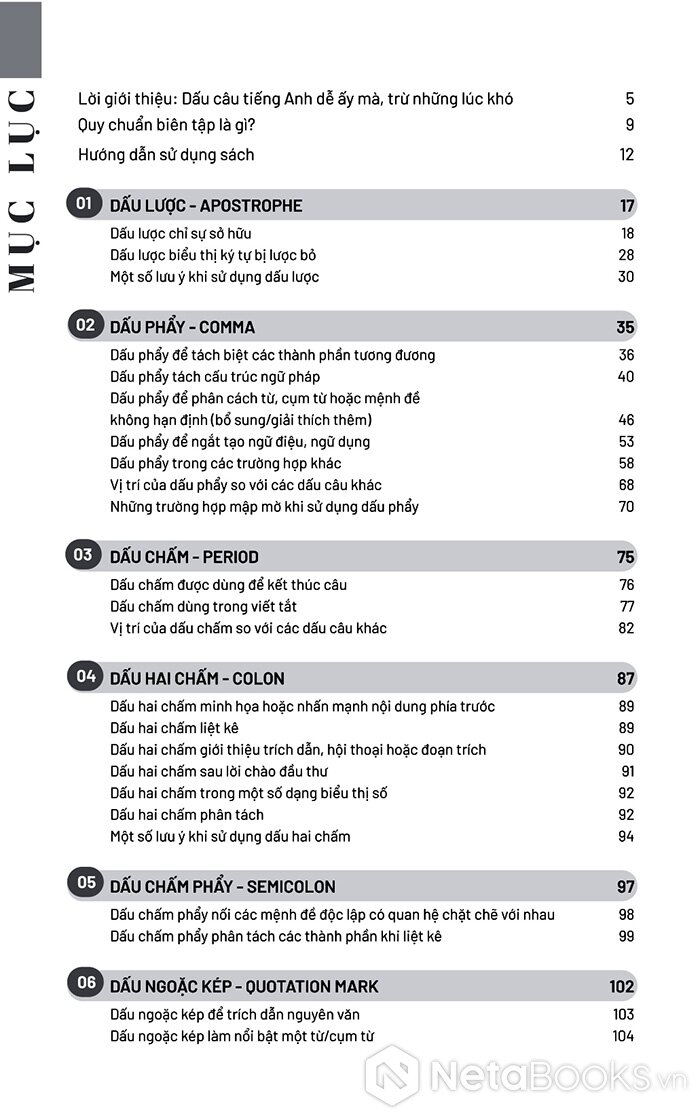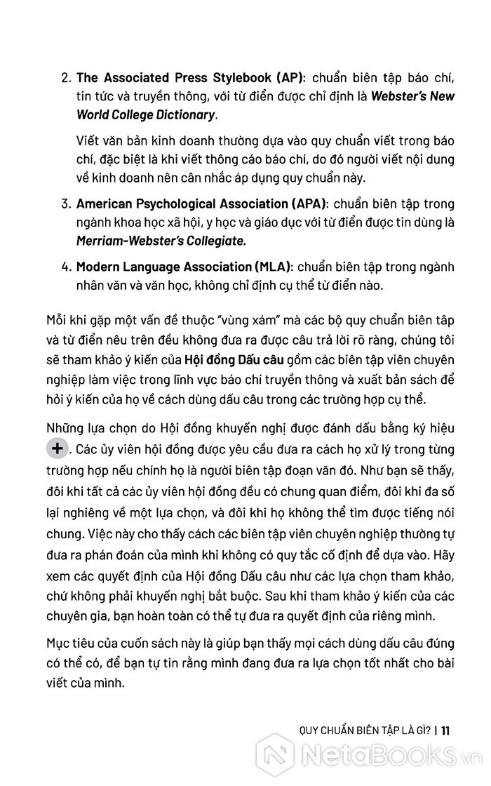 - Sách giải thích tỉ mỉ và rõ ràng về cách dùng 16 loại dấu câu trong tiếng Anh theo các chuẩn biên tập chính của tiếng Anh - Mỹ thông dụng nhất: biên tập sách theo chuẩn Chicago, chuẩn biên tập AP của báo chí/kinh doanh, chuẩn viết và biên tập khoa học MLA và chuẩn viết và biên tập học thuật APA.