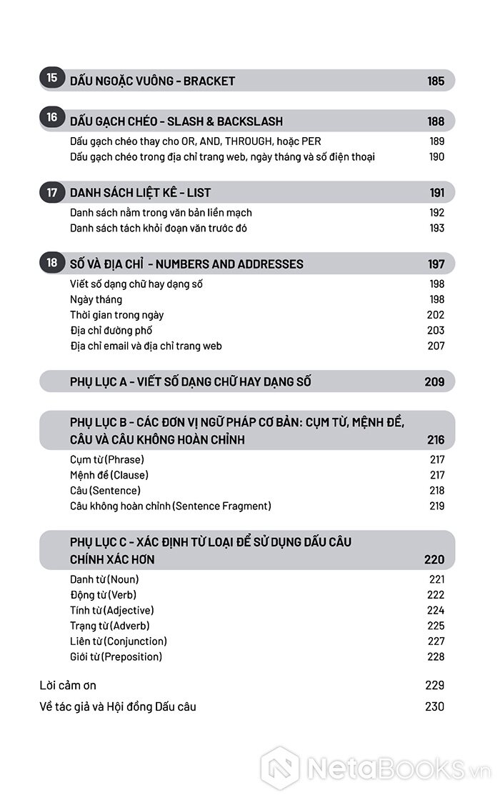 - Sách tặng kèm với phụ lục “Dấu câu từ A đến Z” (có thể truy cập trên Gamma Books app) cung cấp các mục tra cứu nhanh những từ hoặc cụm từ dễ gây nhầm lẫn khi dùng dấu câu, kèm theo giải thích các thuật ngữ liên quan đến dấu câu.