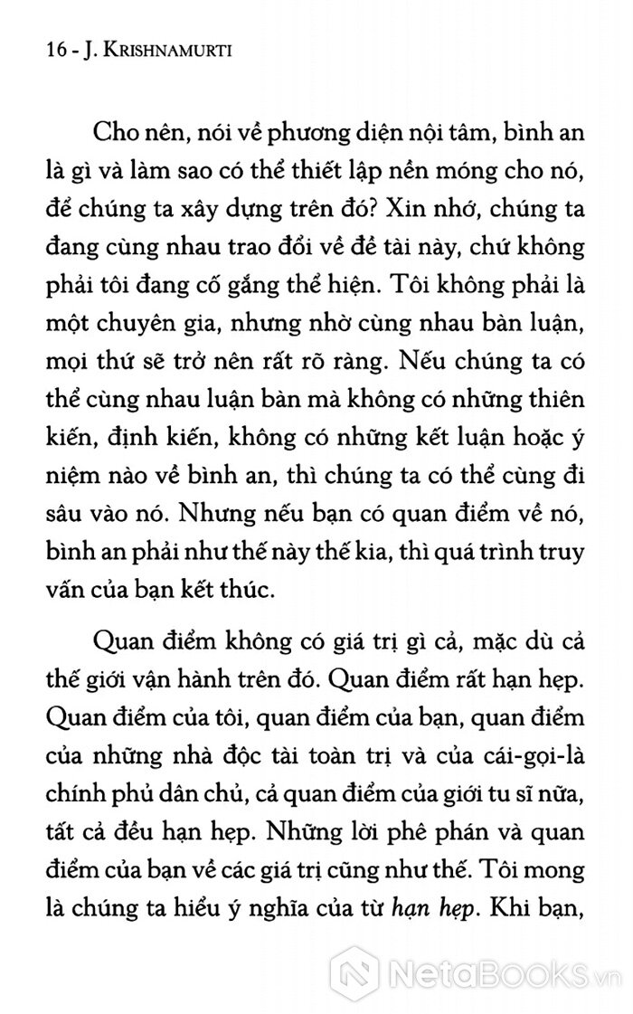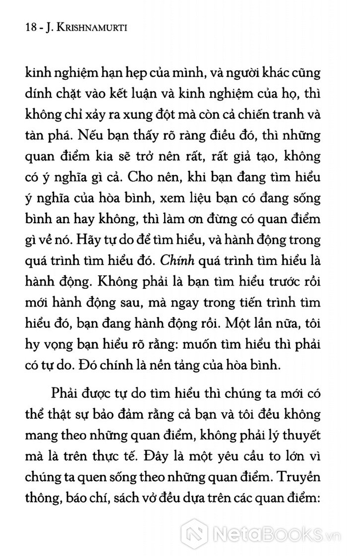 Nếu không có một điều thiết yếu cơ bản như hòa bình, ta sẽ không thể tìm hiểu những điều vĩ đại hơn trong đời sống. Muốn tìm hiểu hòa bình trên thế giới và bình an trong tâm trí là gì, trước hết cần phải nhớ rằng ta không được có định kiến, kết luận hay quan điểm gì về nó. Và quan trọng nhất, đa phần con người chỉ quan tâm đến bản thân, chỉ quan tâm đến tư lợi chứ không vì lợi ích của người khác.