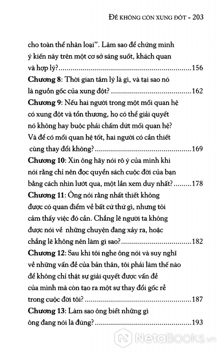 “Để không còn xung đột” (Can conflict end) được chia thành hai phần: phần một là chuỗi sáu bài nói chuyện trước công chúng và phần hai là hỏi đáp. Qua từng bài nói chuyện, Krishnamurti lần lượt khám phá từng vấn đề một: từ bản chất của bộ não, đến cái tôi luôn tìm kiếm sự an toàn trong ảo tưởng, toàn thể loài người đang đứng trên cái nền chung, căn nguyên của xung đột và làm sao để chấm dứt xung đột.