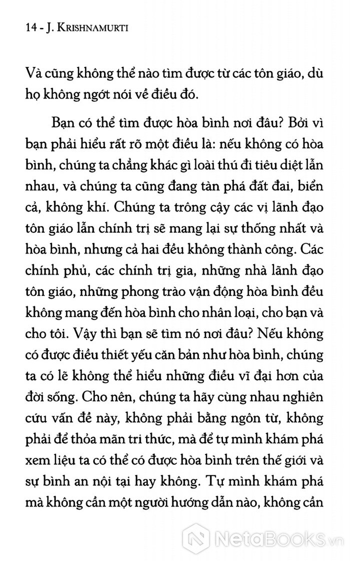 Vậy, để chấm dứt xung đột, chấm dứt bạo lực, ta phải làm gì? Krishnamurti khẳng định bạn không thể kiếm tìm hòa bình nơi các vị lãnh đạo lẫn tôn giáo, cả hai đều không thành công dù họ rao giảng rất nhiều về hòa bình.