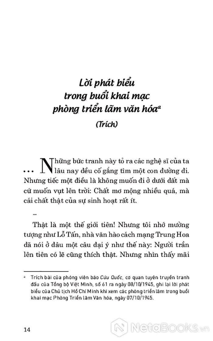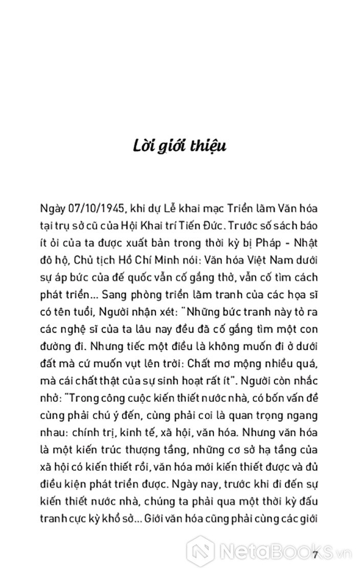 Sáng ngày 07/10/1945, khi dự Lễ khai mạc Triển lãm Văn hóa tại trụ sở cũ của Hội Khai trí Tiến Đức. Trước số sách báo ít ỏi của ta được xuất bản trong thời kỳ bị Pháp - Nhật đô hộ, Người nói: Văn hóa Việt Nam dưới sự áp bức của đế quốc vẫn cố gắng thở, vẫn cố tìm cách phát triển… Sang phòng triển lãm tranh của các họa sĩ có tên tuổi, Người nhận xét: “Những bức tranh này tỏ ra các nghệ sĩ của ta lâu nay đều đã cố gắng tìm một con đường đi. Nhưng tiếc một điều là không muốn đi ở dưới đất mà cứ muốn vụt lên trời: Chất mơ mộng nhiều quá, mà cái chất thật của sự sinh hoạt rất ít”. Người còn nhắc nhở: “Trong công cuộc kiến thiết nước nhà, có bốn vấn đề cùng phải chú ý đến, cùng phải coi là quan trọng ngang nhau: chính trị, kinh tế, xã hội, văn hóa. Nhưng văn hóa là một kiến trúc thượng tầng, những cơ sở hạ tầng của xã hội có kiến thiết rồi, văn hóa mới kiến thiết được và đủ điều kiện phát triển được. Ngày nay, trước khi đi đến sự kiến thiết nước nhà, chúng ta phải qua một thời kỳ đấu tranh cực kỳ khổ sở… Giới văn hóa cũng phải cùng các giới đồng bào đi qua chặng đường ấy. Mong rằng các anh em văn hóa đã cố gắng, xin cố gắng lên mãi, để cùng đồng bào đi đến chỗ hoàn toàn vẻ vang của nước nhà”.