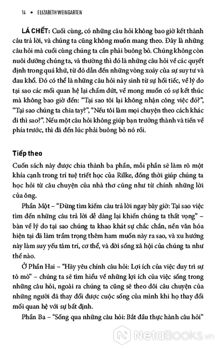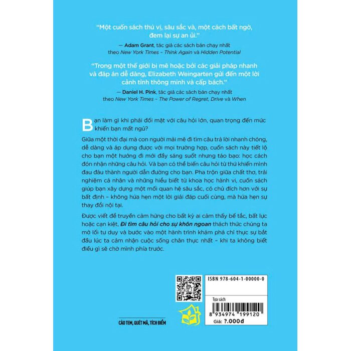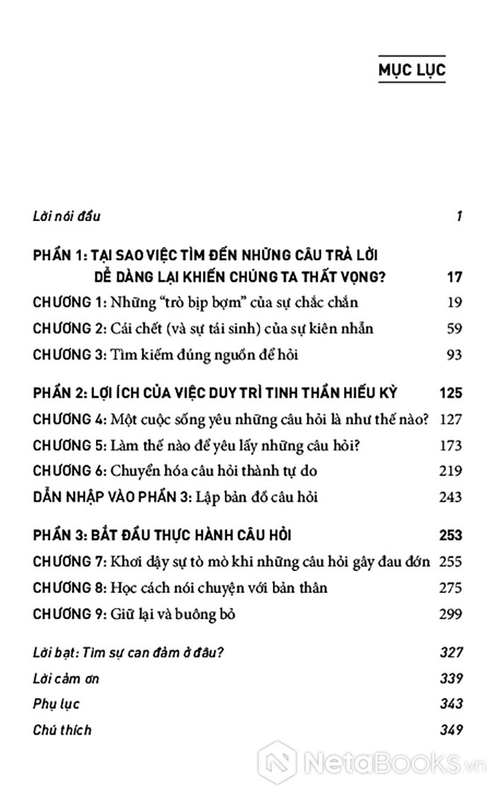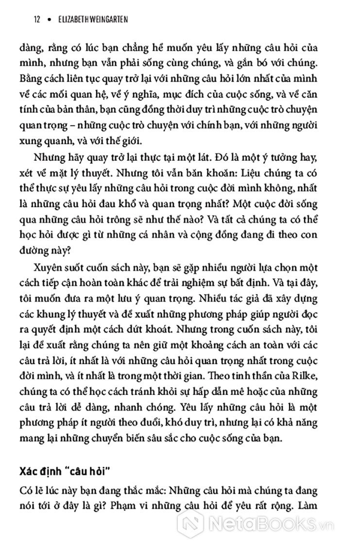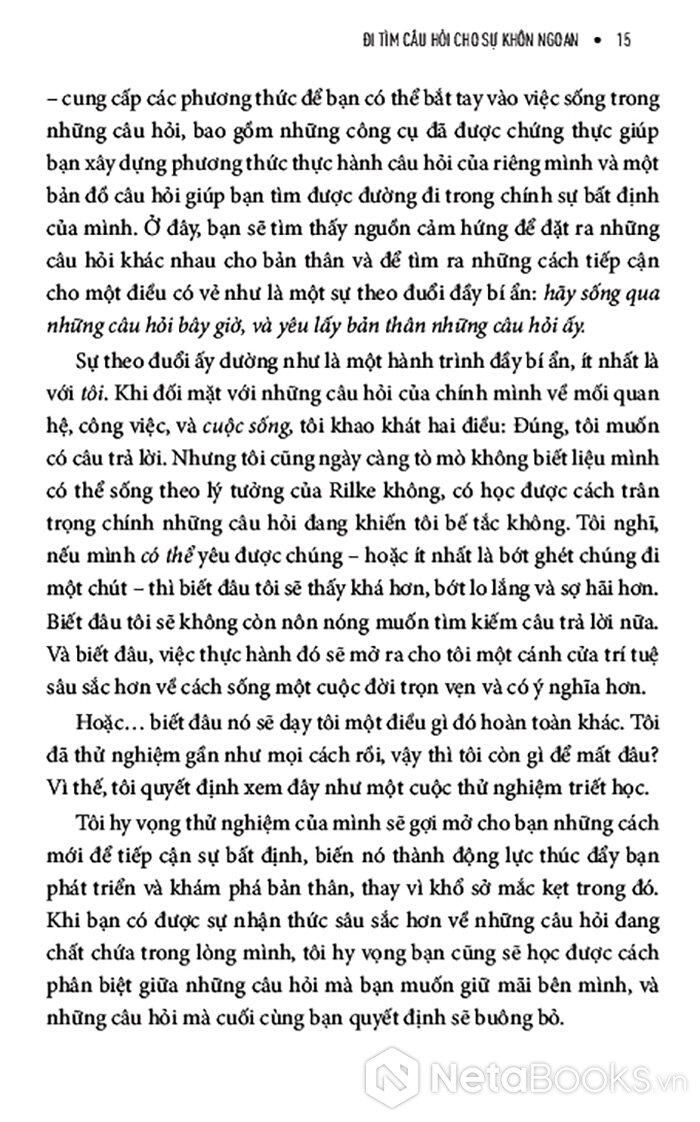 Giữa một thời đại mà con người mải mê đi tìm câu trả lời nhanh chóng, dễ dàng và áp dụng được với mọi trường hợp, cuốn sách này tiết lộ cho bạn một hướng đi mới đầy sáng suốt nhưng táo bạo: học cách đón nhận những câu hỏi. Và bạn có thể biến câu hỏi từ thứ khiến mình đau đáu thành người dẫn đường cho bạn. Pha trộn giữa chất thơ, trải nghiệm cá nhân và những hiểu biết từ khoa học hành vi, cuốn sách giúp bạn xây dựng một mối quan hệ sâu sắc, có chủ đích hơn với sự bất định - không hứa hẹn một lời giải đáp cuối cùng, mà hứa hẹn sự thay đổi nội tại.