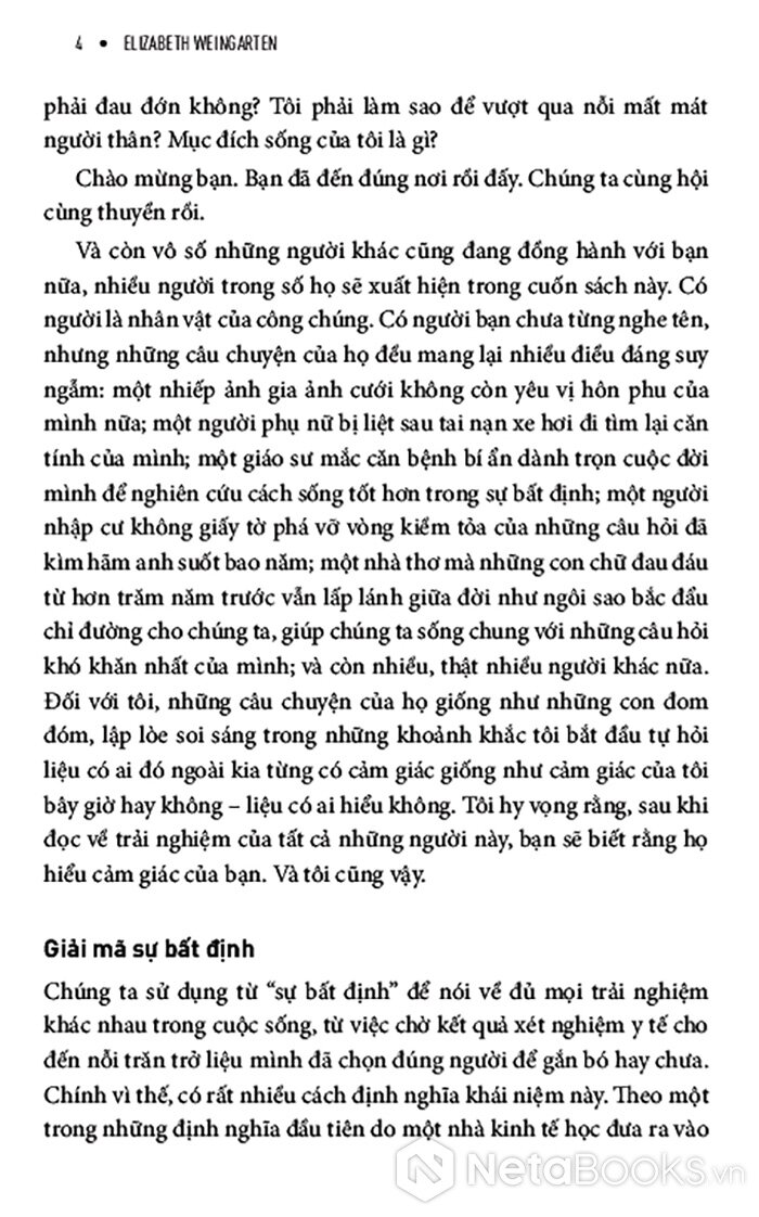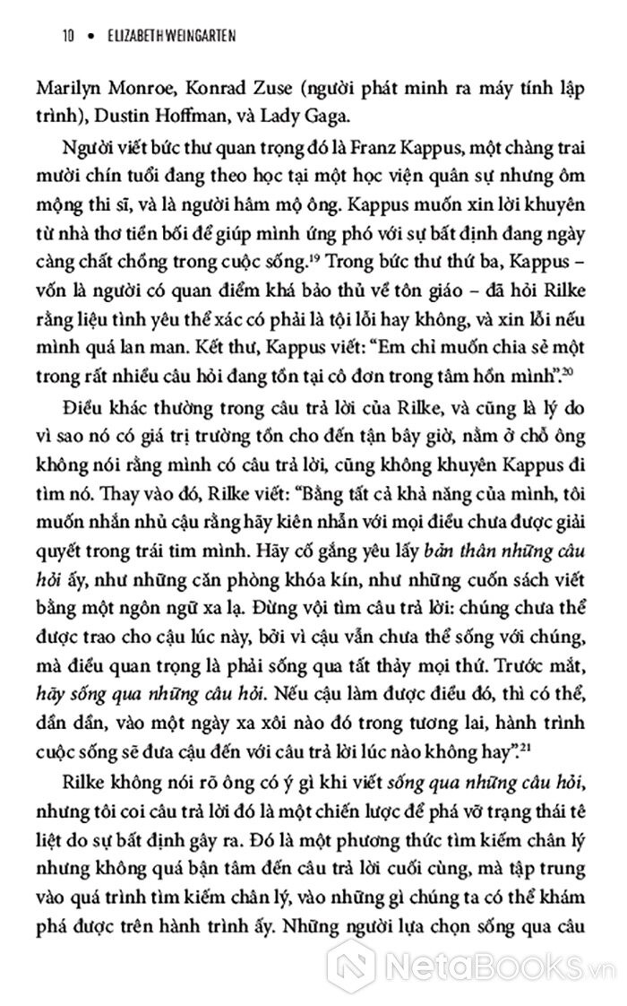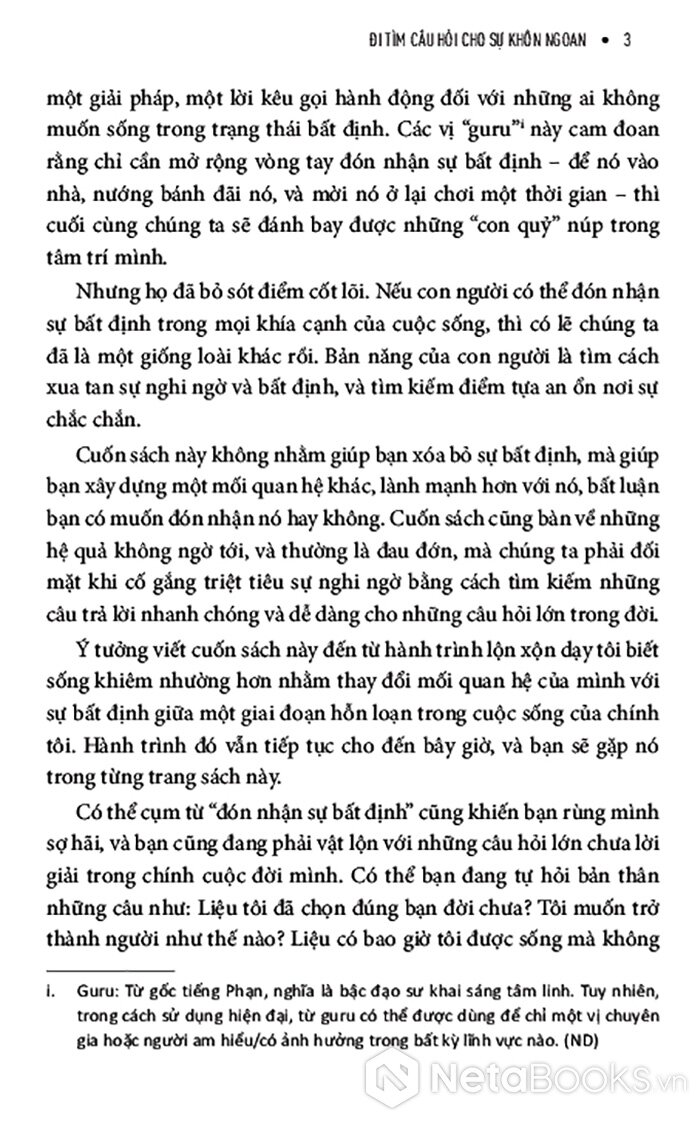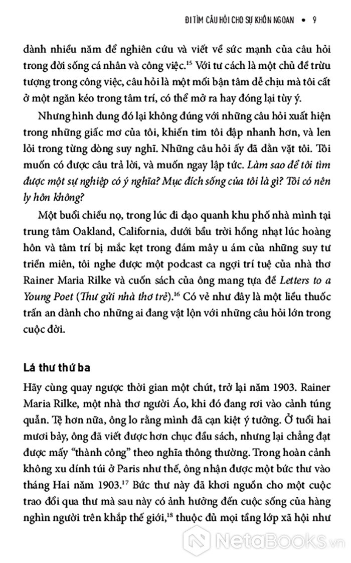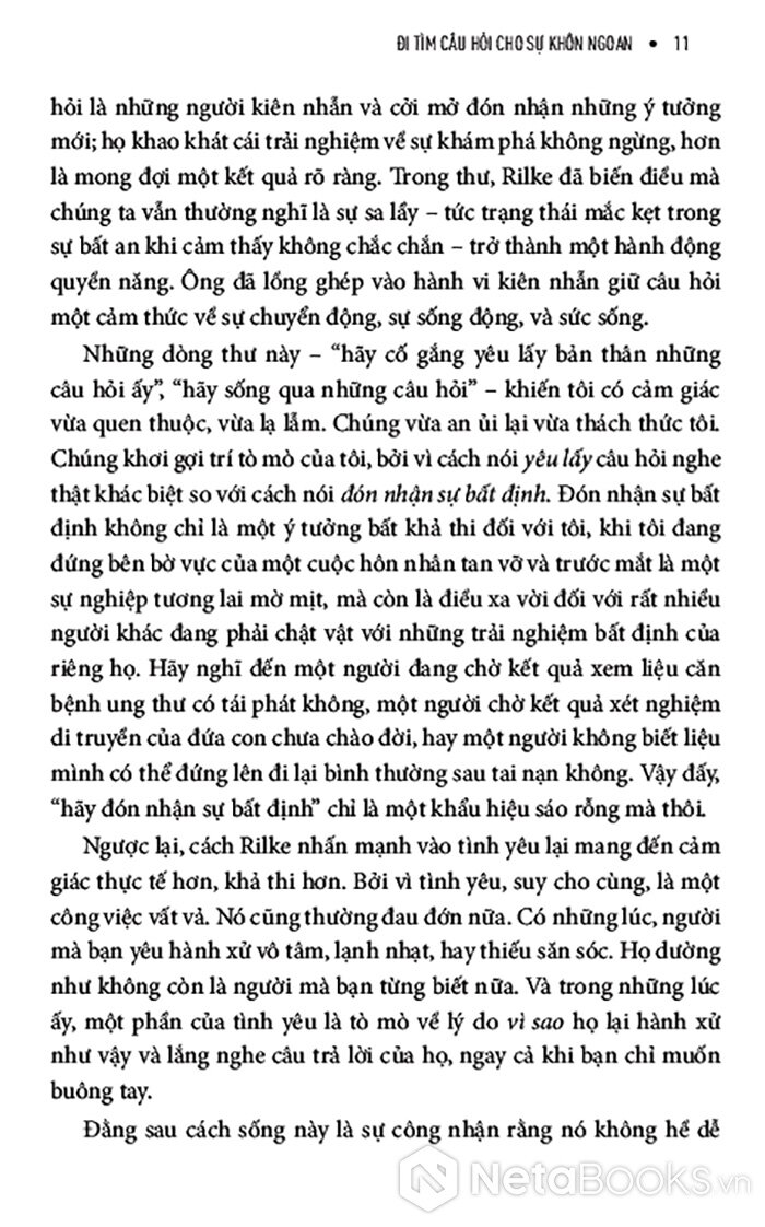 Giữa một thời đại mà con người mải mê đi tìm câu trả lời nhanh chóng, dễ dàng và áp dụng được với mọi trường hợp, cuốn sách này tiết lộ cho bạn một hướng đi mới đầy sáng suốt nhưng táo bạo: học cách đón nhận những câu hỏi. Và bạn có thể biến câu hỏi từ thứ khiến mình đau đáu thành người dẫn đường cho bạn. Pha trộn giữa chất thơ, trải nghiệm cá nhân và những hiểu biết từ khoa học hành vi, cuốn sách giúp bạn xây dựng một mối quan hệ sâu sắc, có chủ đích hơn với sự bất định - không hứa hẹn một lời giải đáp cuối cùng, mà hứa hẹn sự thay đổi nội tại.